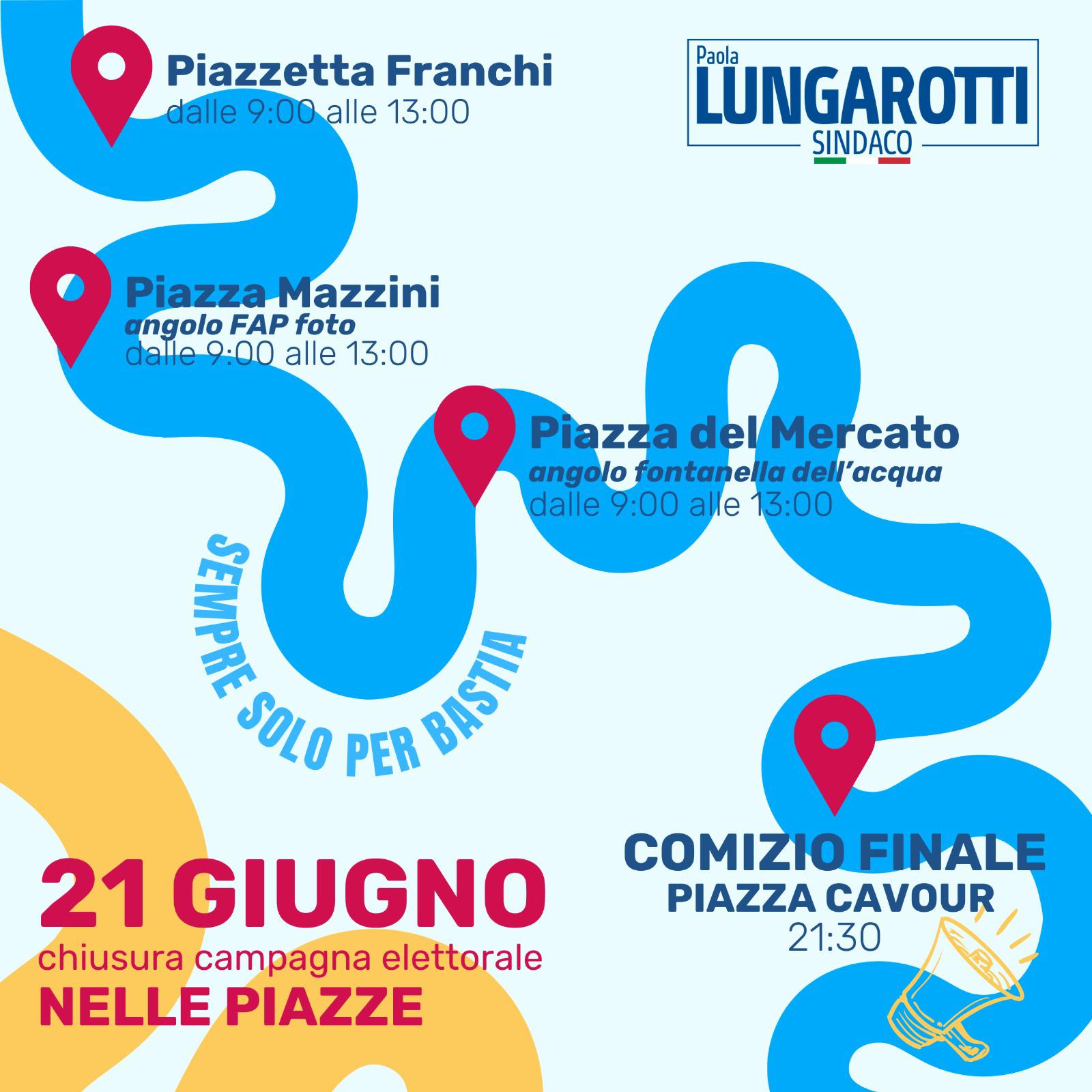 Venerdì 21 giugno dalle 9.00 alle 13.00 i candidati del centro destra unito incontrano le cittadine e i cittadini in Piazzetta Franchi, Piazza Mazzini – angolo Fap foto, Piazza del Mercato – angolo fontanella dell’acqua. Momenti per condividere i punti programmatici del centro destra unito per Bastia