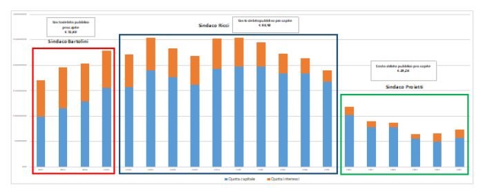 Nello specifico, con l’Amministrazione Proietti la spesa pro–capite annua per il debito pubblico – la rata per intenderci – è di circa 30 euro per ogni cittadino con una notevole diminuzione rispetto alle gestioni Ricci (circa 84 euro per ogni cittadino) ed anche Bartolini (circa 79 euro per ogni cittadino).