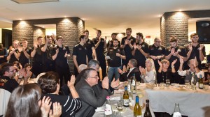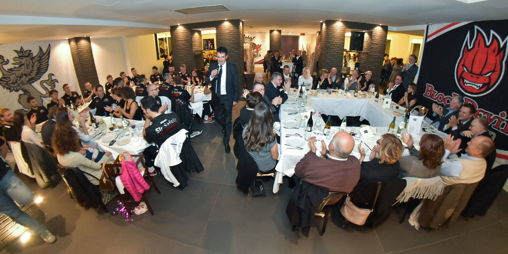 Dopo il bagno di folla pomeridiano con i tifosi da Autocentri Giustozzi, i Block Devils sono stati i principali ospiti dell’evento di fronte alla folta platea degli sponsor societari ansiosi di conoscere dal vivo e di scambiare chiacchiere ed opinioni per i protagonisti in campo della stagione al via domenica. Il consueto spettacolare discorso
