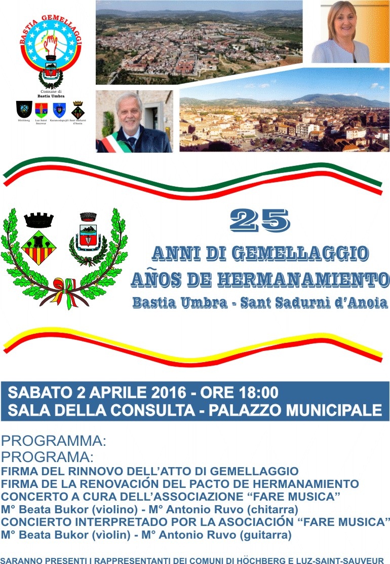 Sabato  2 aprile 2016 sarà firmato il rinnovo del patto di gemellaggio tra i Comuni di Bastia Umbra e Sant Sadurnì d’Anoia (Catalogna), un rapporto di scambi e collaborazione internazionale che compie 25 anni.