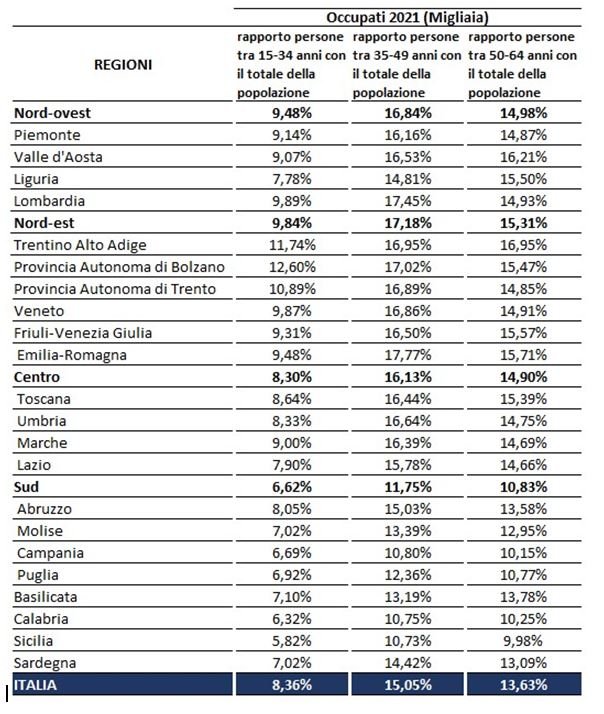 Nel 2021 in Italia gli occupati tra i 15-64 anni sono 21.849.198 che equivalgono ad una percentuale piuttosto bassa (37,04%) se si considera il totale della popolazione italiana (58.983.169). Il maggior numero di lavoratori si riscontra nella fascia d’età tra i 35-49 anni (15,05%). A seguire coloro che hanno tra i 50-64 anni (13,63%) e per ultimi i giovani tra i 15-34 anni (8,36%). È da considerare che, secondo le rilevazioni OCSE, solo il 3,1% dei giovani tra i 15-19 anni lavora (4,2% uomini e 2,0% donne).