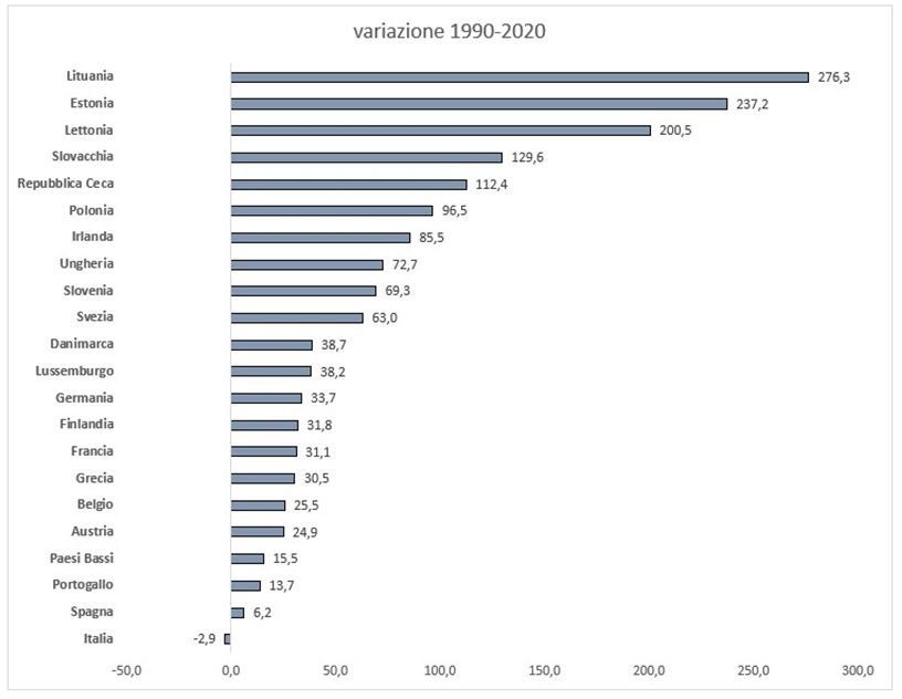 Dai dati OCSE sulla variazione percentuale dei salari annuali medi tra il 1990 e il 2020 si evince che in alcuni Paesi come la Germania e la Francia il salario medio annuale è aumentato rispettivamente di +33,7% e +31,1%. L’Italia è l’unico Paese in cui negli ultimi 30 anni il salario medio annuo non è aumentato ma è, invece, diminuito (-2,9%).