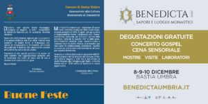 Gli appuntamenti avranno inizio venerdì 8 dicembre con ‘Benedicta Umbria – sapori e luoghi monastici’ che proporrà un concerto gospel, mostre, visite e laboratori insieme a degustazioni gratuite fino a domenica 10 dicembre. In anteprima, giovedì 7 dicembre, per iniziativa dell’Associazione Vivi Bastia, gli artisti del “Nuovo Piccolo Teatro” hanno portato in piazza uno ‘Spettacolo di danza aerea, parata di trampolieri e ninfee illuminate”. Musica e giochi di luce, quindi, per le vie del centro storico di Bastia dalle 17 alle 19.
