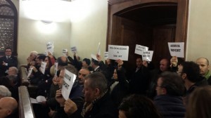 Sala gremita di cittadini nonostante l’orario lavorativo I cittadini con i cartelli: “