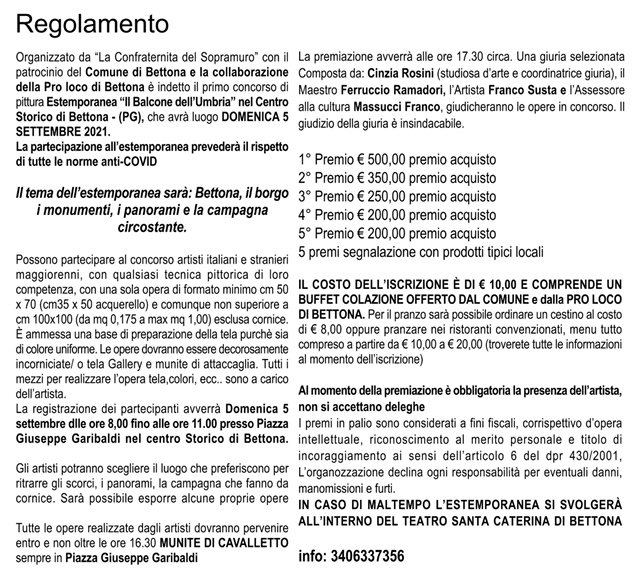 Importante iniziativa su Bettona, organizzata per domenica 5 settembre da il comune di Bettona , la Proloco di Bettona e la Confraternita del Sopramuro. La prima estemporanea di pittura Città di Bettona: “Il balcone dell’Umbria”, dove interverranno numerosi pittori per ammirare e dare vita a bozzetti e quadri colorati, ispirati agli scorci del borgo umbro. Come da regolamento, sono previsti dei premi, per in vincitori , in denaro e in prodotti tipici offerti da importanti aziende e agriturismo del territorio comunale.