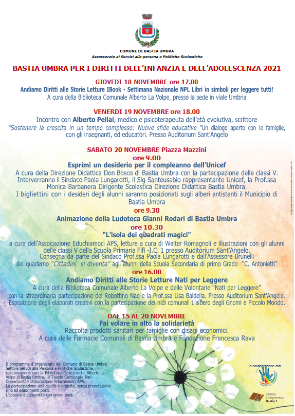 Il programma è organizzato dal Comune di Bastia Umbra Settore Servizi alla Persona e Politiche Scolastiche in collaborazione con la Biblioteca Comunale Alberto La Volpe di Bastia Umbra, il Tavolo comunale Pari Opportunità e l’Associazione Educhiamoci APS