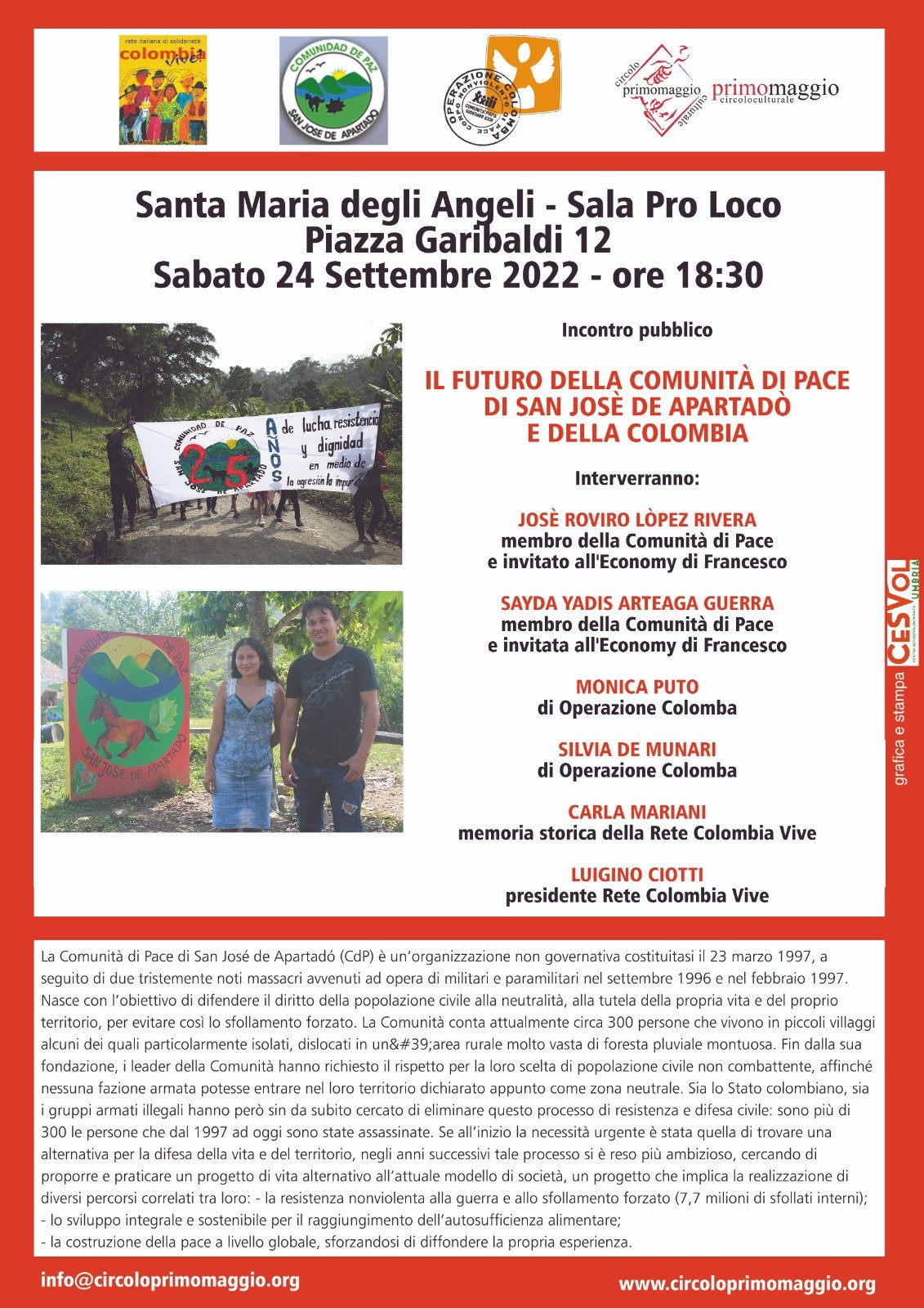 “Il futuro della Comunità di Pace di San Josè de Apartadò e della Colombia” alla Pro Loco di S. Maria degli Angeli.