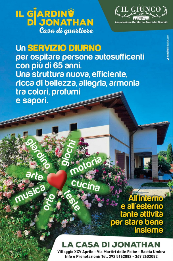Il servizio diurno che accoglie persone autosufficienti con più di 65 anni a Bastia Umbra presso la Casa di Jonathan a Villaggio XXV Aprile in via Martiri delle Foibe, un luogo di ben-essere per l’età matura.