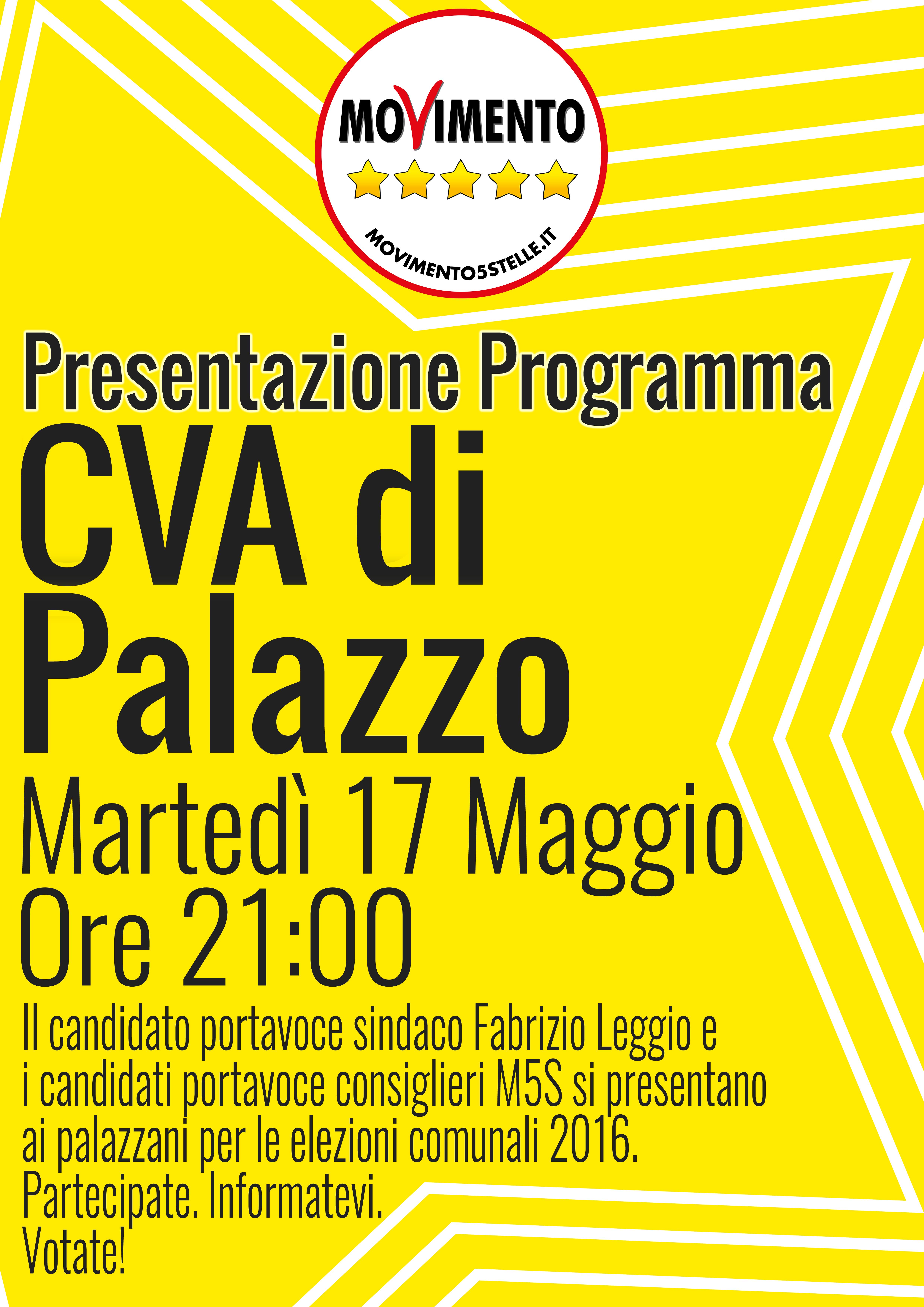 Il Movimento 5 Stelle Assisi invita i cittadini alla presentazione del programma presso il Centro di Vita Associativa (CVA) di Palazzo, saranno presenti il candidato portavoce sindaco Fabrizio Leggio e tutti i candidati portavoce consiglieri. Molti saranno i temi trattati, dal problema rifiuti al progetto AgriCultura passando per il sostegno alle PMI e lo sviluppo del turismo escursionistico. Vi aspettiamo!