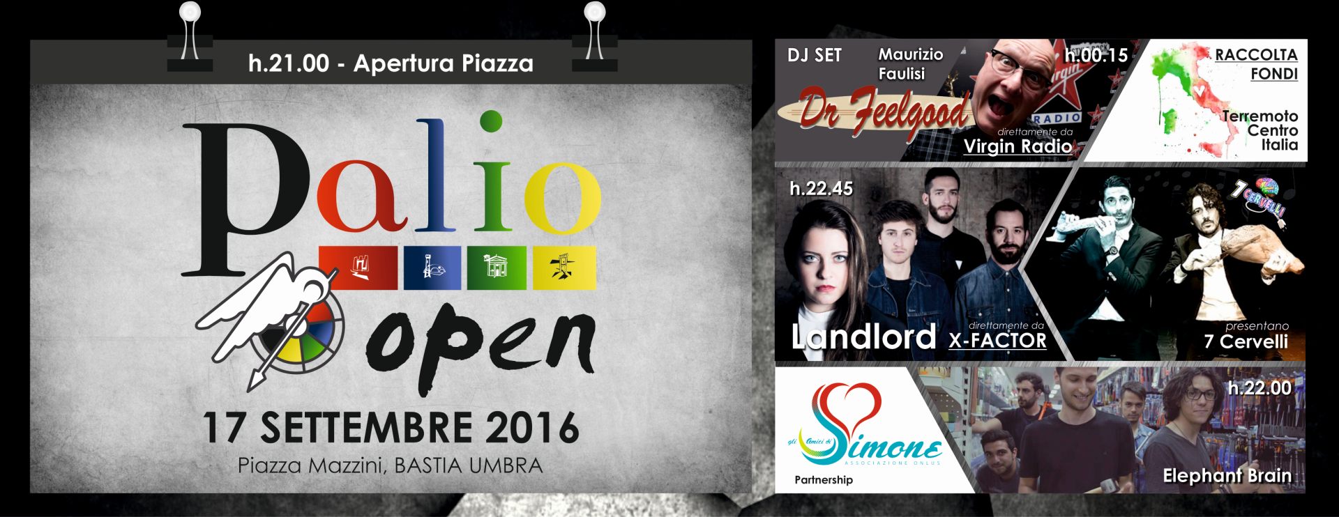 Presenteranno la serata i 7Cervelli. Ad aprire il concerto saranno gli Elephant Brain (ore 21.30), giovane e promettente band perugina. Successivamente, alle 22.30, saliranno sul palco i LandLord. Dopo il successo strepitoso di X-Factor 2015, la band riminese approda a PaliOpen come l’ospite principale di questa prima edizione. La seconda parte dell’evento sarà allietata dalle note di Virgin Radio con il Dj Set di Maurizio Faulisi in arte “Dr. Feelgood”, che trasformerà Piazza Mazzini in una vera e propria discoteca all’aperto. PaliOpen inoltre, è anche un’occasione per dimostrare attivamente la solidarietà nei confronti delle popolazioni colpite dal Terremoto del Centro Italia. Siete tutti invitati a partecipare alla raccolta fondi.