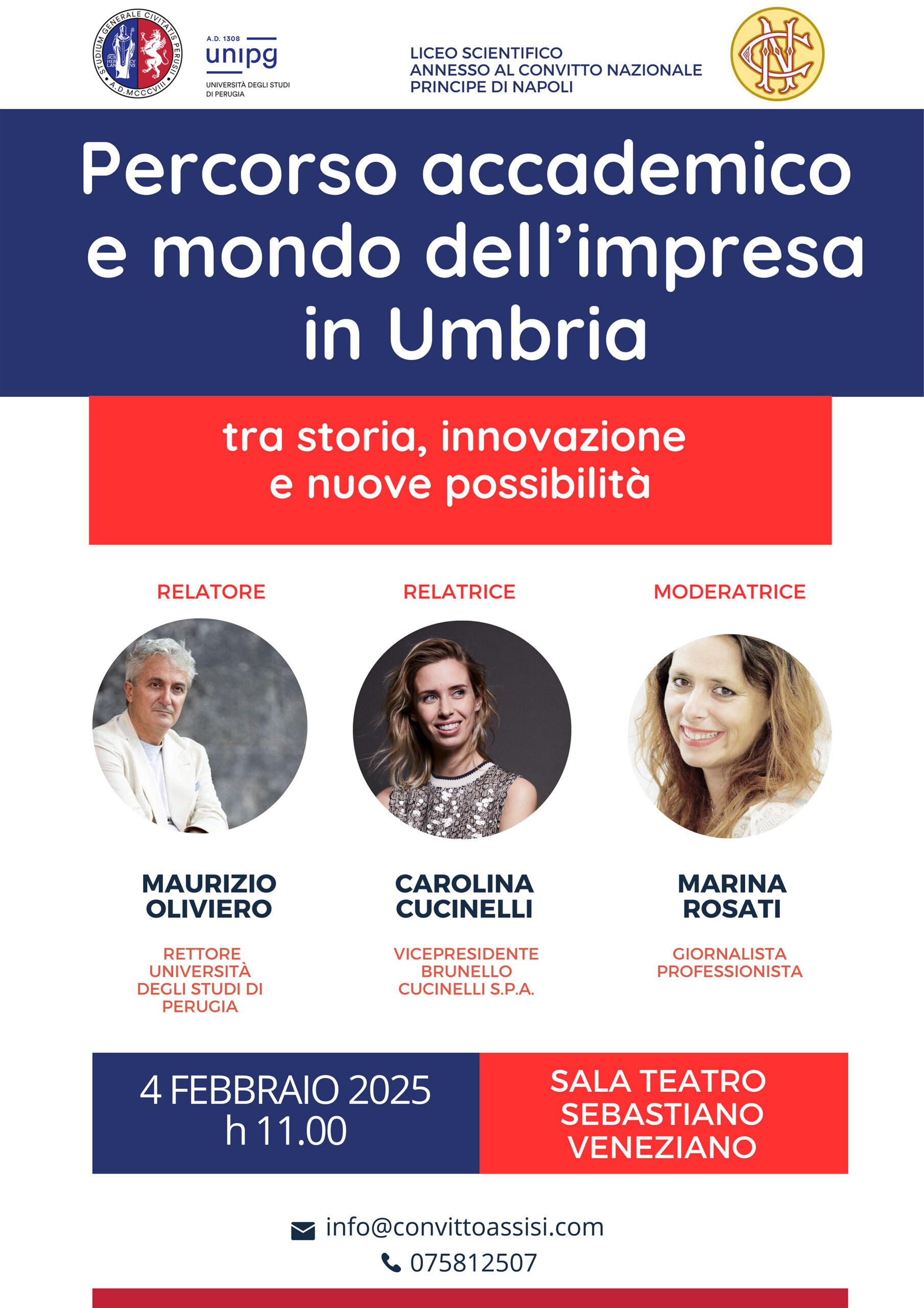 Assisi, 28 gennaio 2025 – “Percorso accademico e mondo dell’impresa in Umbria, tra storia, innovazione e nuove possibilità”: è questo il titolo dell’incontro in programma il 4 febbraio alle ore 11,00 nel teatro del Convitto Nazionale “Principe di Napoli” di Assisi, al quale prenderanno parte il Rettore dell’Università degli studi di Perugia, Prof. Maurizio Oliviero, e Carolina Cucinelli, vice presidente e co-direttrice creativa della Brunello Cucinelli S.p.A.. L’incontro, moderato dalla giornalista Marina Rosati, è rivolto alle classi quarte e quinte del liceo Scientifico e sarà seguito da un momento di Q&A con gli studenti protagonisti.