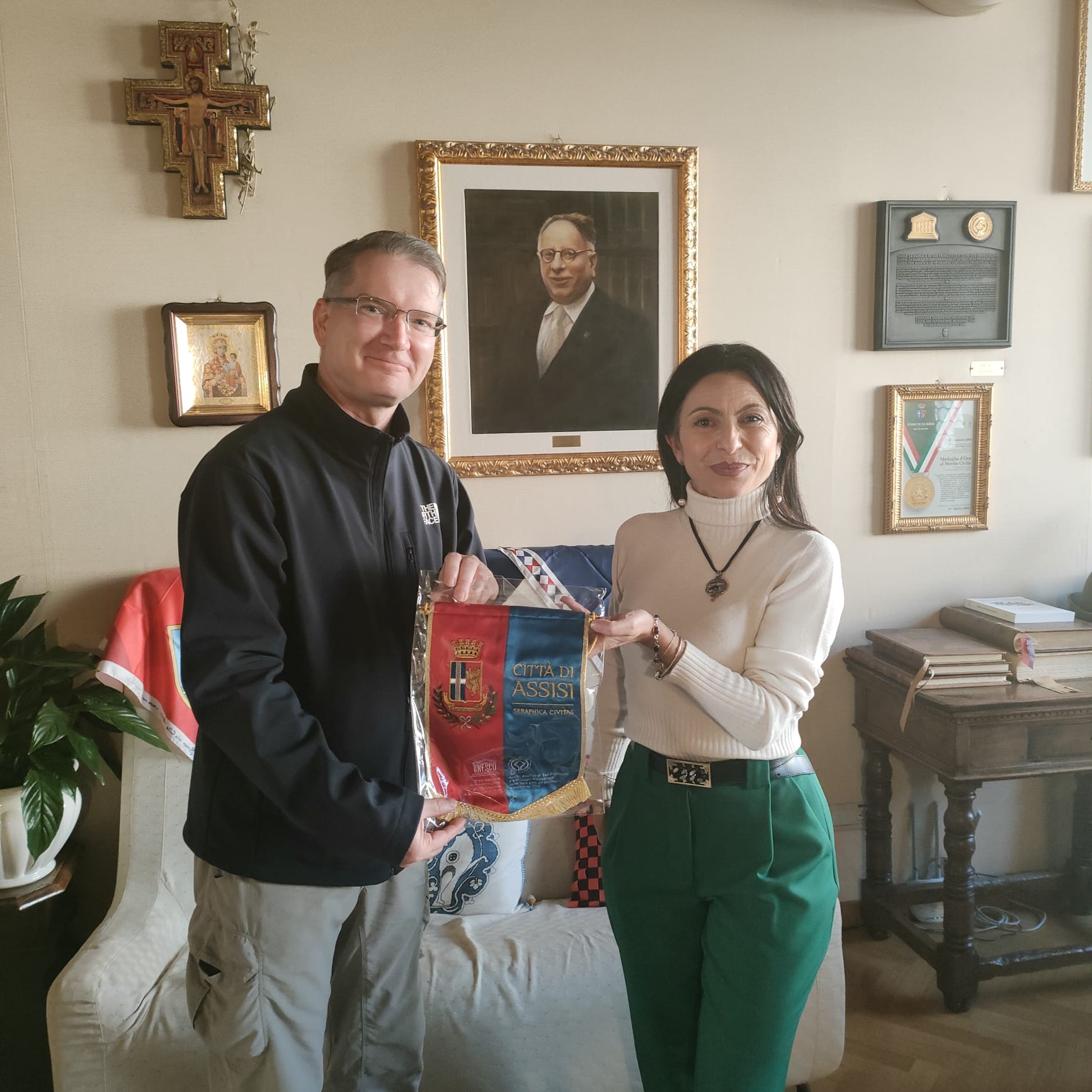 Il sindaco dal canto suo ha consegnato a Sawn Crowley alcuni doni tra cui il libro “Assisi oltre le mura” e il gagliardetto con il simbolo e i colori della città.
