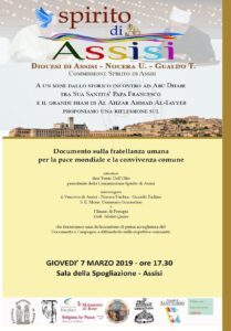 ASSISI – A distanza di un mese dalla firma del documento sulla fratellanza umana per la pace mondiale e la convivenza comune, tra papa Francesco e il Grande Imam di Al-Azhar Ahmad Al-Tayyeb, giovedì 7 marzo alle ore 17,30 nella sala della Spogliazione di Assisi, il vescovo della diocesi di Assisi – Nocera Umbra – Gualdo Tadino, monsignor Domenico Sorrentino e l’Imam di Perugia, Abdel Qader firmeranno una dichiarazione di pieno accoglimento del documento e l’impegno a diffonderlo nelle rispettive comunità. “Ci troveremo a riflettere sul Documento di Abu Dhabi – spiega il presidente della Commissione Spirito di Assisi don Tonio Dell’Olio che terrà l’introduzione – e a vivere insieme il momento della firma della dichiarazione da parte del nostro vescovo e dell’Imam di Perugia che impegna le rispettive comunità a mettere in pratica ciò che il Pontefice e il grande Imam di Al Azhar hanno sottoscritto.