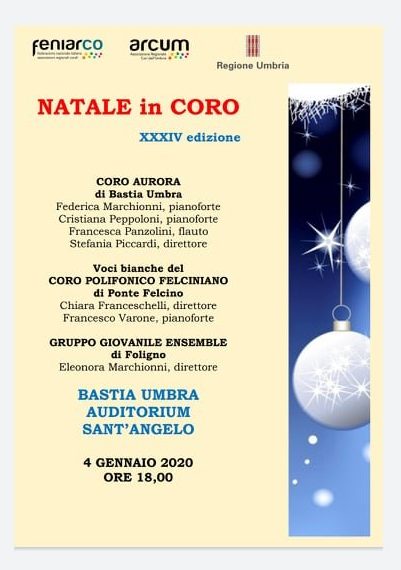dalle 18,00 alle 19,00 NATALE IN CORO rassegna cori giovanili e voci bianche ARCUM, presso Auditorium S. Angelo con il Coro Aurora di Bastia Umbra, Voci bianche del Coro polifonico Felciniano di Ponte Felcino, Gruppo Giovanile Ensemble di Foligno