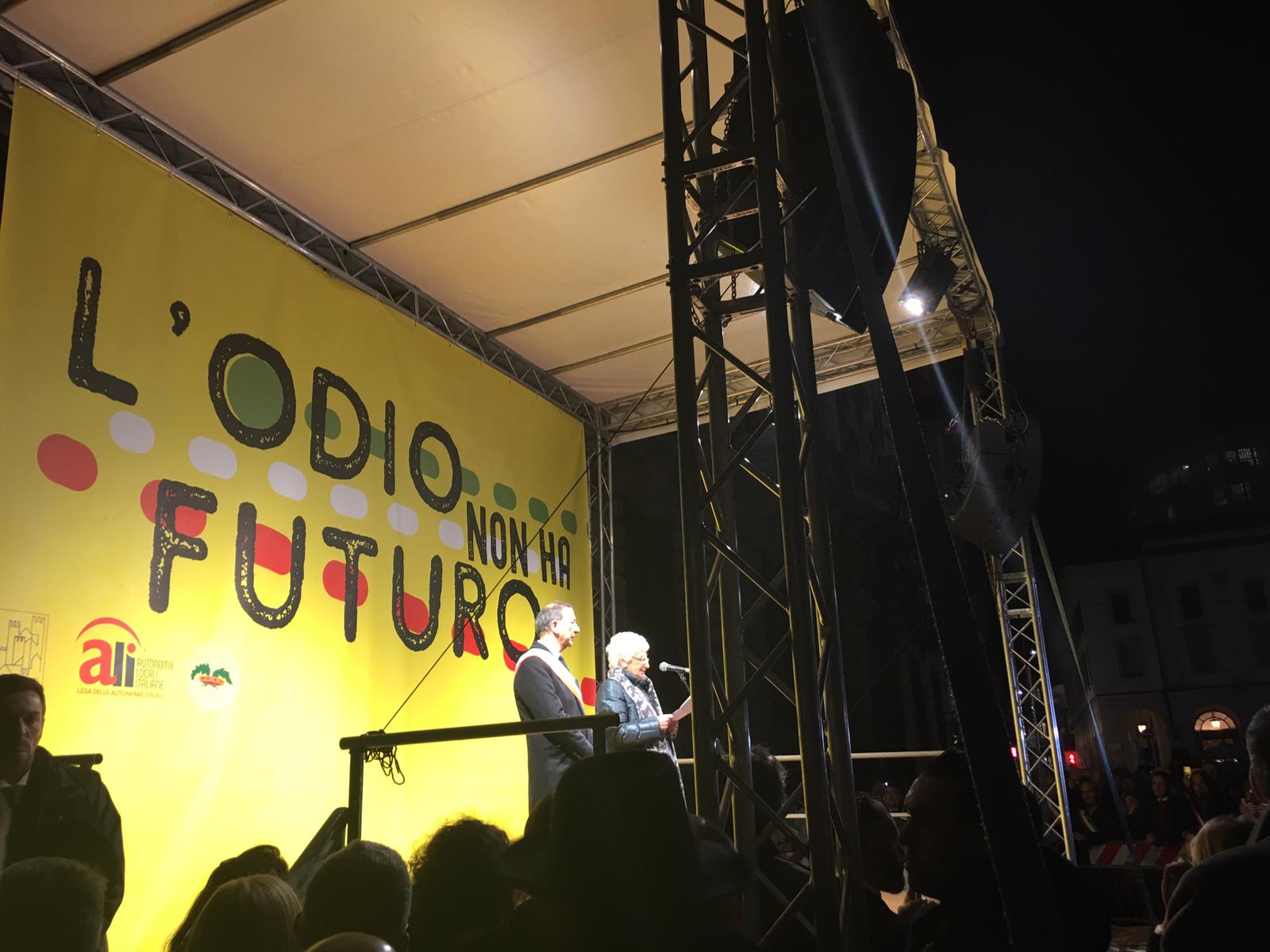 ‘L’odio non ha futuro” era la scritta sullo striscione giallo che ha aperto il corteo da piazza dei Mercanti fino a piazza della Scala davanti al municipio dove la senatrice a vita ha preso la parola, abbracciata dai 600 primi cittadini in fascia tricolore.