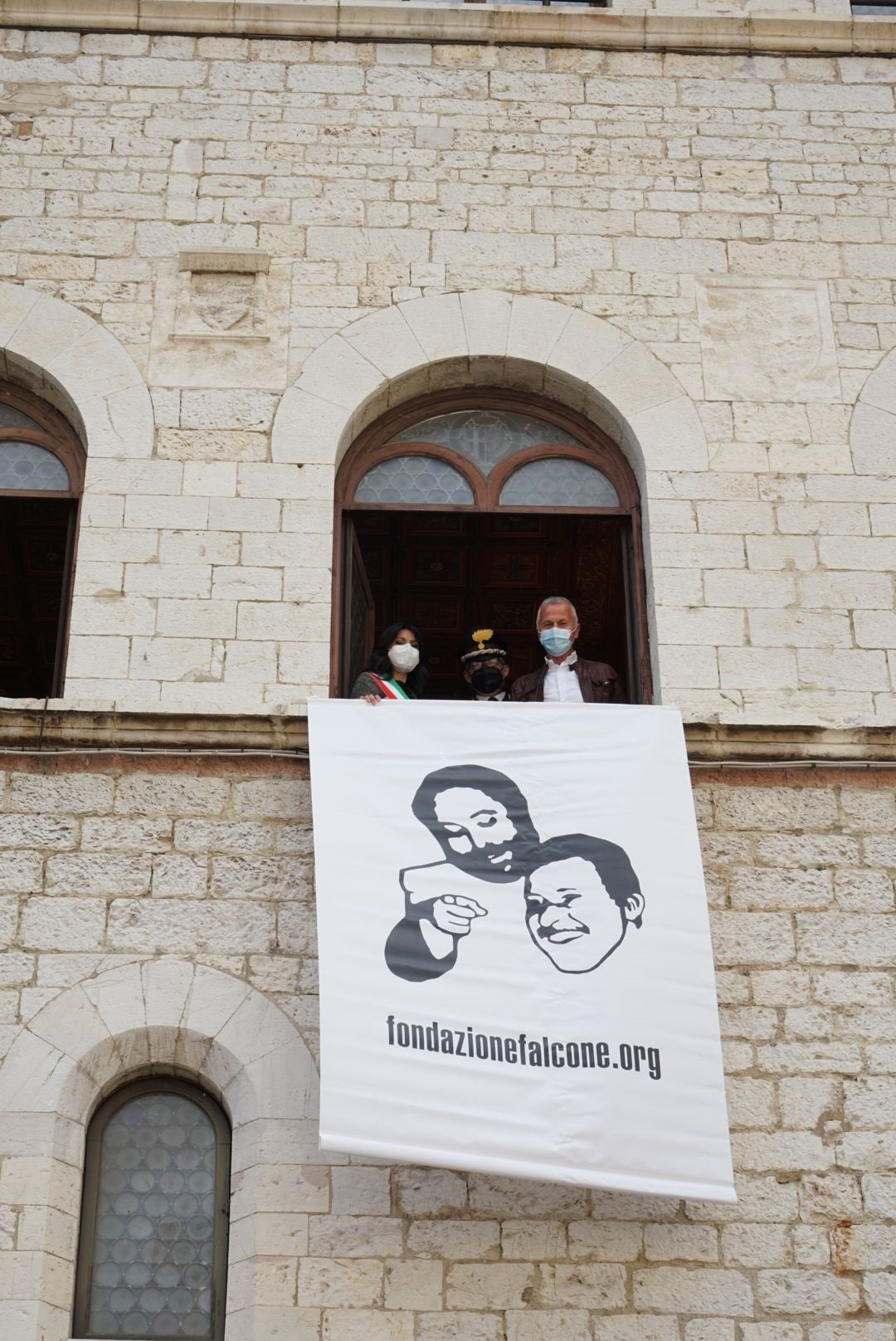 Prima della conclusione della cerimonia, svoltasi in maniera semplice e sobria, c’è stato lo svelamento della targa. Un’appendice alla manifestazione: l’esposizione da una delle finestre del palazzo comunale del lenzuolo bianco realizzato dalla Fondazione Falcone e dal Ministero dell’Istruzione in ricordo dei giudici eroi. Un lenzuolo contro la mafia per non dimenticare, un messaggio simbolico da Assisi, città della pace e della legalità.