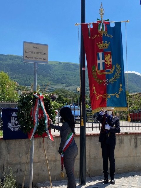 Prima della conclusione della cerimonia, svoltasi in maniera semplice e sobria, c’è stato lo svelamento della targa. Un’appendice alla manifestazione: l’esposizione da una delle finestre del palazzo comunale del lenzuolo bianco realizzato dalla Fondazione Falcone e dal Ministero dell’Istruzione in ricordo dei giudici eroi. Un lenzuolo contro la mafia per non dimenticare, un messaggio simbolico da Assisi, città della pace e della legalità.
