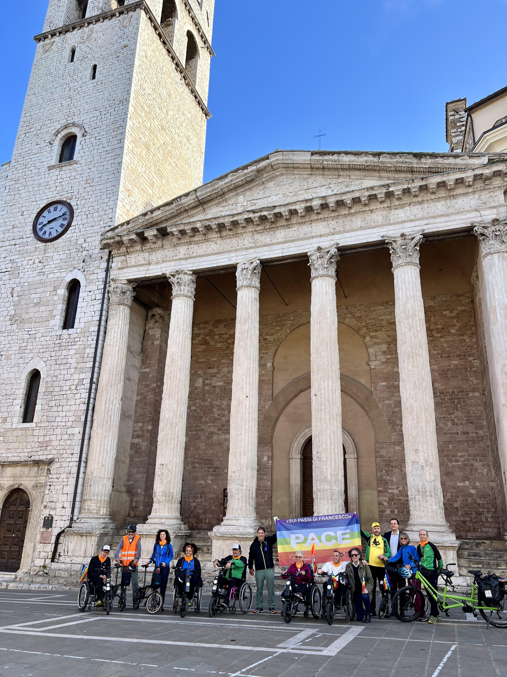 L’obiettivo del percorso – promosso da Free Wheels, organizzazione di volontariato impegnata a diffondere il turismo lento per tutti, stimolando istituzioni e privati a rendere accessibili percorsi, strutture e servizi – è avvicinare all’esperienza del cammino anche le persone disabili e sensibilizzare la comunità a considerare la disabilità non un limite, ma una risorsa. L’idea dei viaggiatori – che si muovono in sedia a rotelle grazie a propulsore elettrico agganciato alla carrozzina o, nel caso di ipovedenti, in tandem con guida assistita – è anche quella di valorizzare il territorio attraverso forme di pellegrinaggio inclusivo, in vista del Giubileo del 2025. Non a caso l’itinerario si chiama “Sui passi di Francesco, in cammino per accessibilità e pace” e si fa portatore di un messaggio di pace, accoglienza e speranza. Tutti valori che il Comune di Assisi sostiene e promuove, anche attraverso azioni concrete per rendere la città sempre più accessibile anche a persone con disabilità, cercando di superare anche alcuni limiti legati alle sue caratteristiche strutturali di borgo medievale.