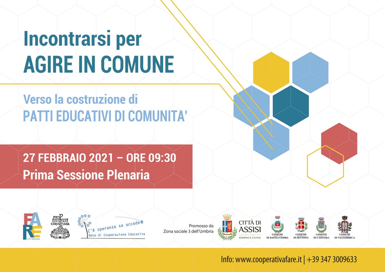 “Incontrarsi per agire in Comune – Verso la costruzione di Patti Educativi di Comunità”, è curato da FARE cooperativa sociale, Pro Civitate Christiana di Assisi e Rete di Cooperazione Educativa e promosso dalla Zona Sociale 3 dell’Umbria. Il progetto vedrà coinvolti dirigenti scolastici ed insegnanti delle scuole dei cinque Comuni di Assisi, Bastia Umbra, Bettona, Cannara e Valfabbrica, insieme ad istituzioni e realtà del terzo settore che, a vario titolo, sono parte attiva nei processi formativi ed educativi della popolazione 0-18, come teatri, musei, circoli di lettura, associazioni sportive, culturali e sociali, parrocchie: una comunità educante che ha già superato i 60 attori territoriali.