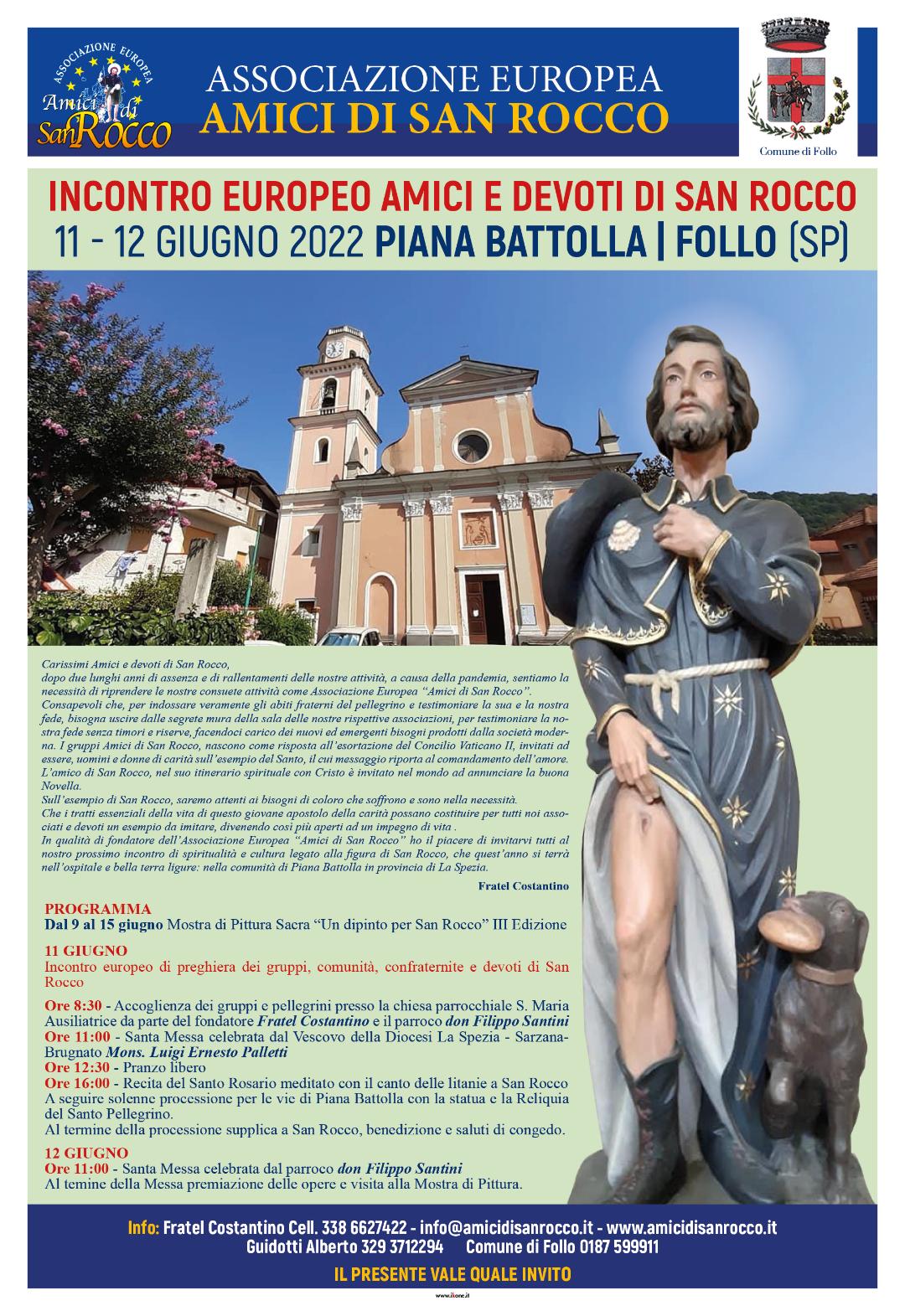 In qualità di fondatore dell’Associazione Europea “Amici di San Rocco” ho il piacere di invitarvi tutti al nostro prossimo incontro di spiritualità e cultura legato alla figura di San Rocco, che quest’anno si terrà nell’ ospitale e bella terra ligure: nella comunità di Piana Battolla in provincia di La Spezia.