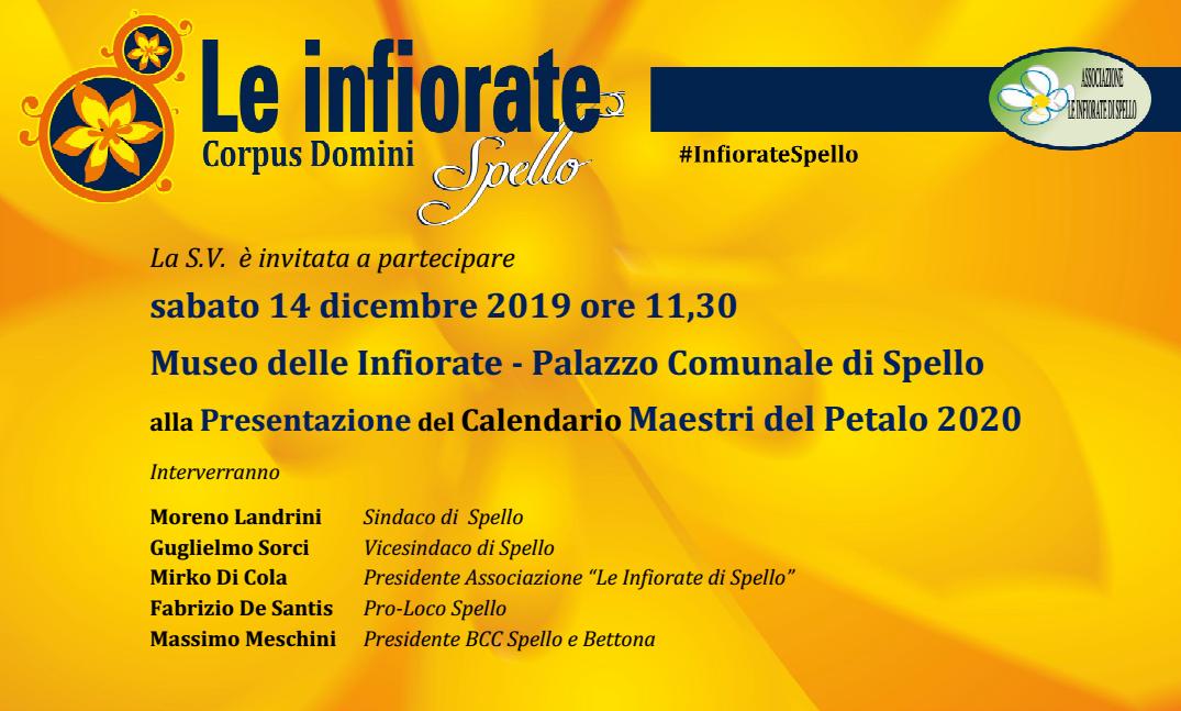 Siamo lieti di invitarvi a partecipare sabato 14 dicembre 2019 alle ore 11.30 nel Museo delle Infiorate – Palazzo Comunale di Spello, alla presentazione del Calendario 2020 “Maestri del Petalo” . Interverranno: il sindaco di Spello Moreno Landrini, il vicesindaco Guglielmo Sorci, il presidente dell’Associazione Le Infiorate di Spello Mirko di Cola, il presidente della Pro-Loco Spello Fabrizio De Santis e il presidente BCC Spello e Bettona Massimo Meschini.