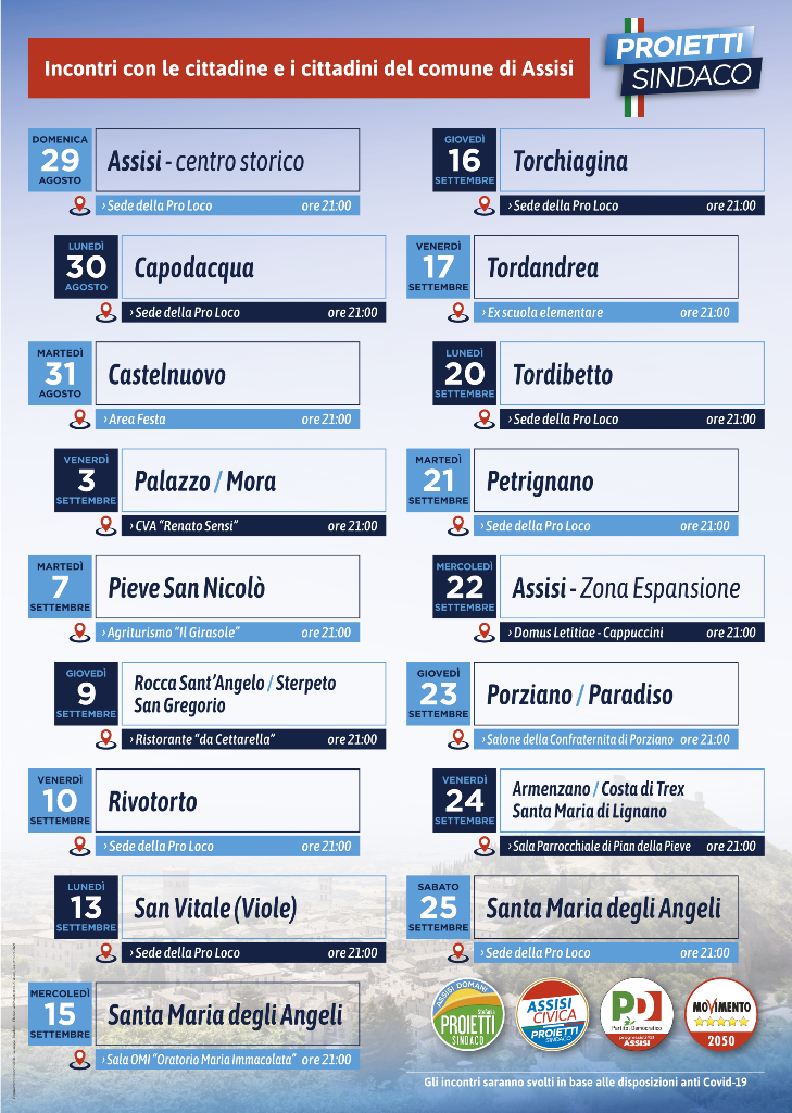 Gli incontri, in programma sempre alle 21:00, partono il 29 agosto da Assisi centro storico (Pro loco), a seguire il 30 a Capodacqua (Pro loco) e il 31 a Castelnuovo (area festa). Il mese di settembre si apre con l’incontro a Palazzo e Mora (CVA “Renato Sensi”), per poi proseguire il 7 settembre a Pieve San Nicolò (agriturismo Il Girasole), il 9 settembre a Rocca Sant’Angelo, Sterpeto, San Gregorio (ristorante da Cettarella). Il 10 settembre è la volta di Rivotorto (Pro loco), il 13 settembre Viole San Vitale (Pro loco), il 15 settembre Santa Maria degli Angeli (Sala Omi). E ancora, il 16 settembre a Torchiagina (Pro loco), il 17 a Tordandrea (ex scuola elementare), il 20 Tordibetto (Pro loco), il 21 a Petrignano (Pro loco), il 22 nella zona di espansione di Assisi (Domus Letitiae), il 23 a Porziano e Paradiso (salone confraternita Porziano), il 24 ad Armenzano, Costa di Trex e Santa Maria di Lignano (salone parrocchiale di Pian della Pieve) e infine il 25 settembre a Santa Maria degli Angeli (Pro loco).