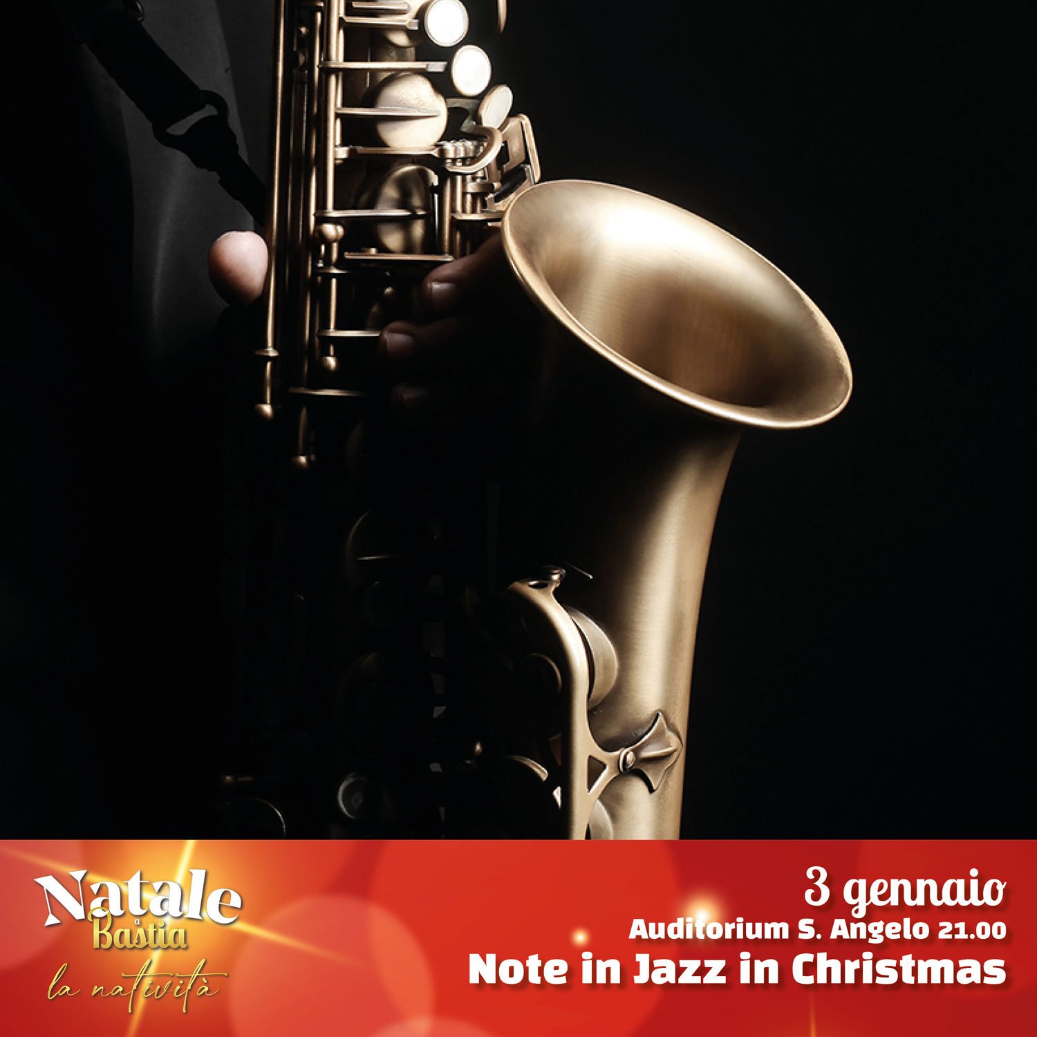 MARTEDI’ 3 GENNAIO 2023 CONCERTO NOTE JAZZ IN CHRISTMAS Elisa Tonelli, voce, Lorenzo Bisogno, sassofono, Massimo Pucciarini, pianoforte, Marco Marino, contrabbasso. A cura della Scuola di Musica Comunale – Ass. FAREMUSICA. Auditorium Sant’Angelo ore 21.00