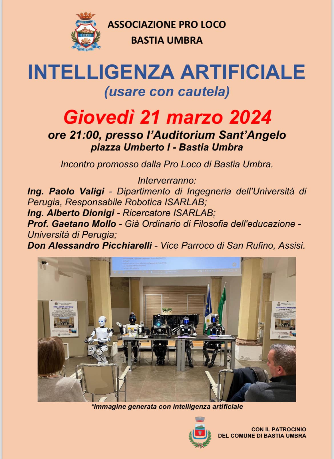 L’Associazione Pro Loco di Bastia Umbra promuove un incontro dal titolo “Intelligenza Artificiale (usare con cautela)”, Giovedì 21 marzo 2024 ore 21, 00. L’incontro, patrocinato dal Comune di Bastia Umbra, si svolgerà presso l’Auditorium Sant’Angelo in piazza Umberto I, a Bastia Umbra. Interverranno l’ Ing. Paolo Valigi – Dipartimento di Ingegneria dell’Università di Perugia, Responsabile Robotica ISARLAB; l’ Ing. Alberto Dionigi – Ricercatore ISARLAB; il Prof. Gaetano Mollo – Già Ordinario di Filosofia dell’educazione – Università di Perugia, Don Alessandro Picchiarelli – Vice Parroco di San Rufino, Assisi.