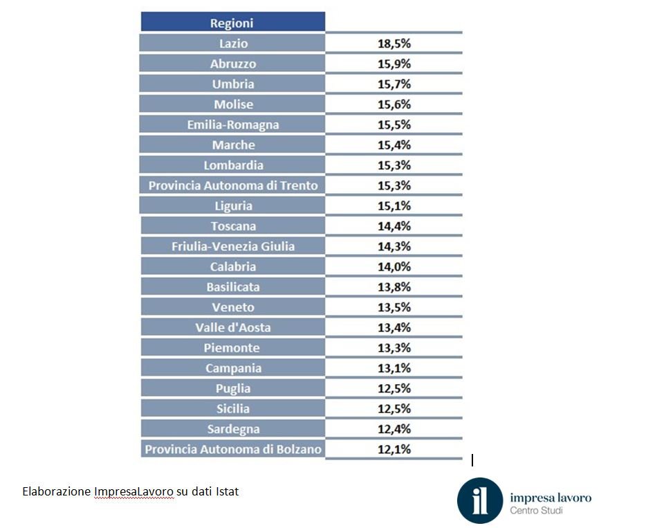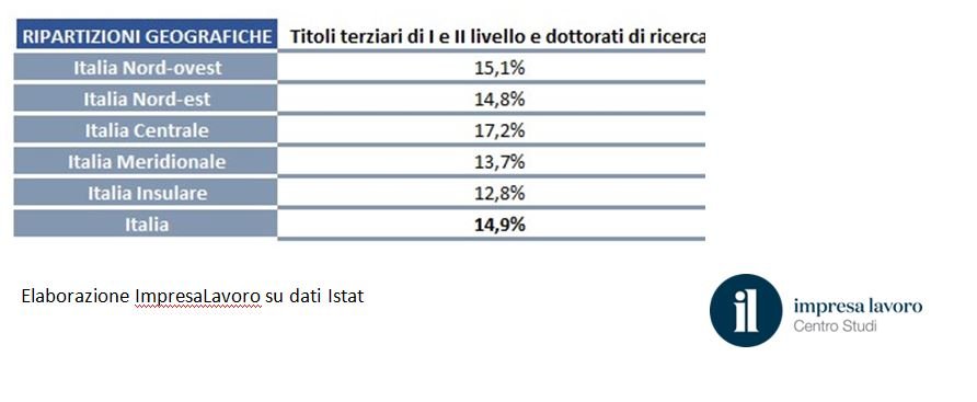In Italia nel 2020 la media nazionale dei laureati in possesso di un titolo di studio terziario di I e II livello è di 14,5%, a differenza del 2019 in cui la cui percentuale era del 13,9%. La classifica a livello regionale mostra una maggiore quantità di laureati in Lazio (18,5%). Al secondo posto si trova l’Abruzzo (15,9%), continuando con l’Umbria (15,7%), il Molise (15,6%), Emilia-Romagna (15,5%) e Marche (15,4%). La percentuale più bassa di laureati si registra nella provincia di Bolzano (12,1%), seguita dalla Sardegna (12,4%), Sicilia e Puglia (12,5%). Lo rivela una ricerca del Centro studi ImpresaLavoro dell’imprenditore Massimo Blasoni, realizzata su elaborazione di dati Istat.