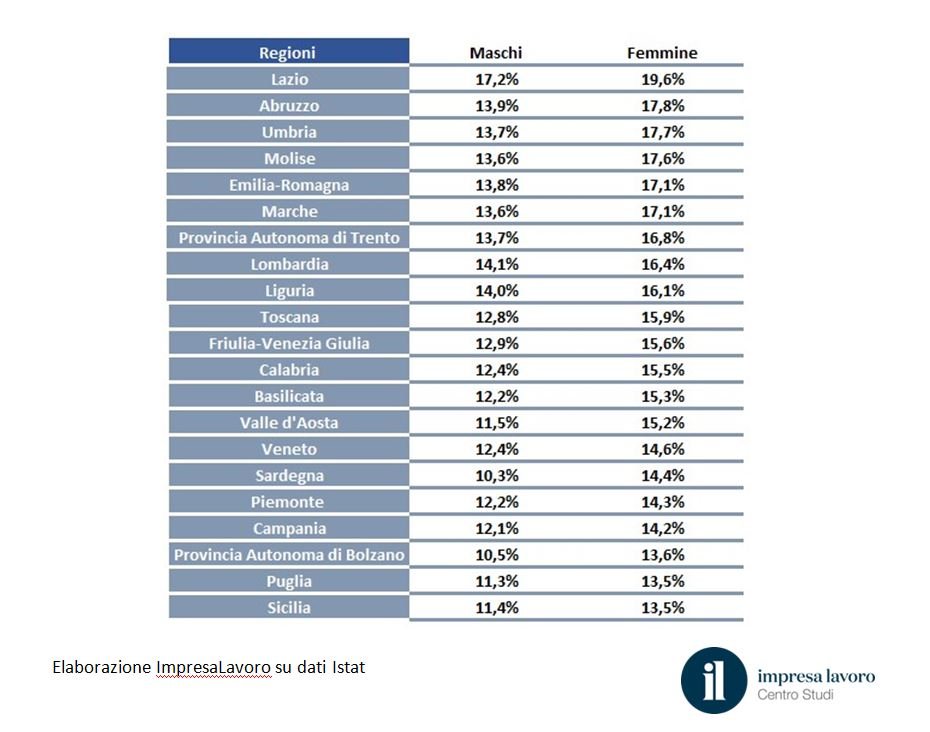 Nel 2020 in tutte le regioni italiane risultano aver conseguito il titolo di laurea più le donne rispetto agli uomini. Il Lazio, la regione con più laureati in Italia, possiede anche la percentuale più alta di laureate donne (19,6%), seguita da Abruzzo (17,8%), Umbria (17,7%), Molise (17,6%), Emilia-Romagna e Marche (17,1%). Per gli uomini le percentuali più elevate di laureati si trovano in Lazio (17,2%), in Lombardia (14,1%), Liguria (14%), Abruzzo (13,9%) e Emilia-Romagna (13,8%).