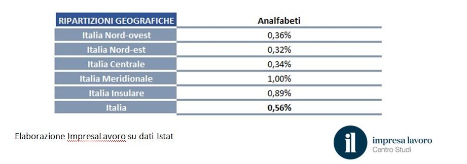 Rimane un divario tra Nord e Sud anche per quanto riguarda l’analfabetismo: l’Italia Meridionale e Insulare (1% e 0,89%) hanno una percentuale più alta rispetto al Nord-ovest/est (0,36% e 0,32%), Centro (0,34%) e alla media nazionale (0,56%).
