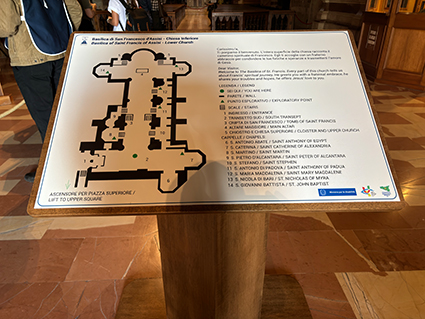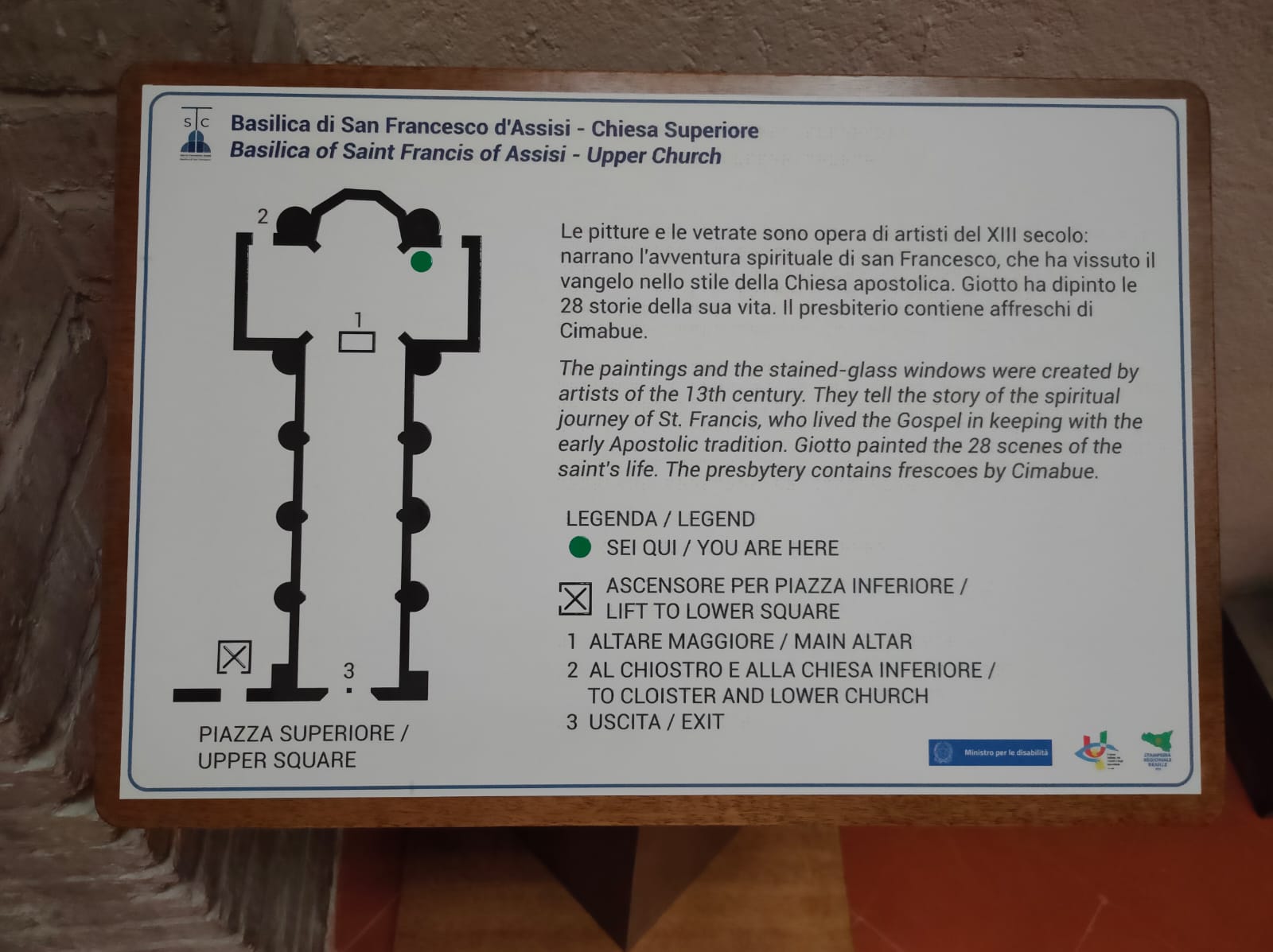 I 10 sostegni (nella chiesa superiore, in corrispondenza dei due ingressi – anteriore e posteriore – sono posti dei pannelli braille con lo stesso contenuto) dei pannelli e delle mappe sono realizzati in legno dalla falegnameria interna del Sacro Convento, sotto la direzione dell’Ufficio tecnico della Basilica.