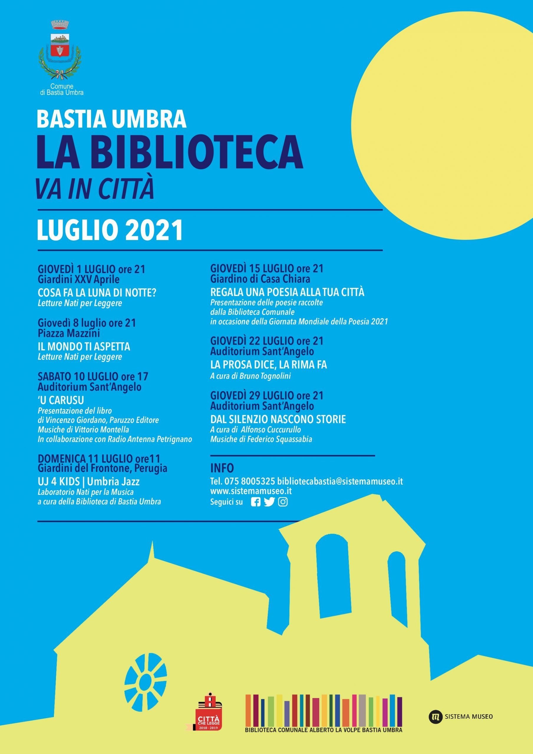 Il primo appuntamento giovedì 1 luglio alle ore 21.00 presso i Giardini Pubblici di XXV Aprile. “Cosa fa la luna di notte?” Letture con il prezioso contributo delle volontarie Nati per leggere. La Biblioteca Comunale di Bastia da oltre dieci anni promuove appuntamenti mensili dedicati ai bambini da 0 a 6 anni e alle mamme in dolce attesa perché nei primi 3 anni di vita c’è uno sviluppo cerebrale del bambino che caratterizzerà tutta la sua esistenza. Gli appuntamenti con Nati per Leggere continuano l’8 luglio in Piazza Mazzini con “Il mondo ti aspetta” sempre alle ore 21.00. All’Auditorium Sant’Angelo Sabato 10 luglio alle ore 17.00 “U carusu”, presentazione del libro di Vincenzo Giordano – Paruzzo Editore, il 22 luglio “La prosa dice, la rima fa” a cura di Bruno Tognolini, il 29 luglio “Dal silenzio nascono storie” a cura di Alfonso Cuccurullo, Musiche di Federico Squassabia. Nel Giardino di Casa Chiara il 15 luglio “Regala una poesia alla tua citta”, saranno presentate le poesie raccolte dalla Biblioteca Comunale in occasione della Giornata Mondiale della Poesia 2021. L’11 luglio Umbria Jazz Kids, con il Laboratorio Nati per la musica la Biblioteca Alberto La Volpe si sposterà a Perugia presso i Giardini del Frontone.