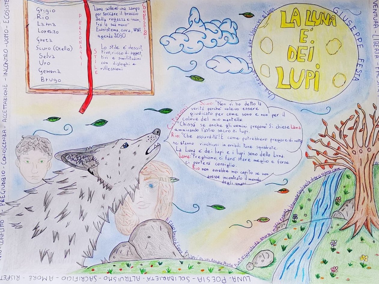Gli alunni hanno voluto omaggiare Giuseppe Festa con degli one pager nei quali in una pagina hanno riassunto i passaggi più rilevanti del libro; con essi è stata realizzata una presentazione in cui è stata riassunta la splendida e importante esperienza che ha fatto comprendere che la luna è dei lupi e i lupi sono della luna.