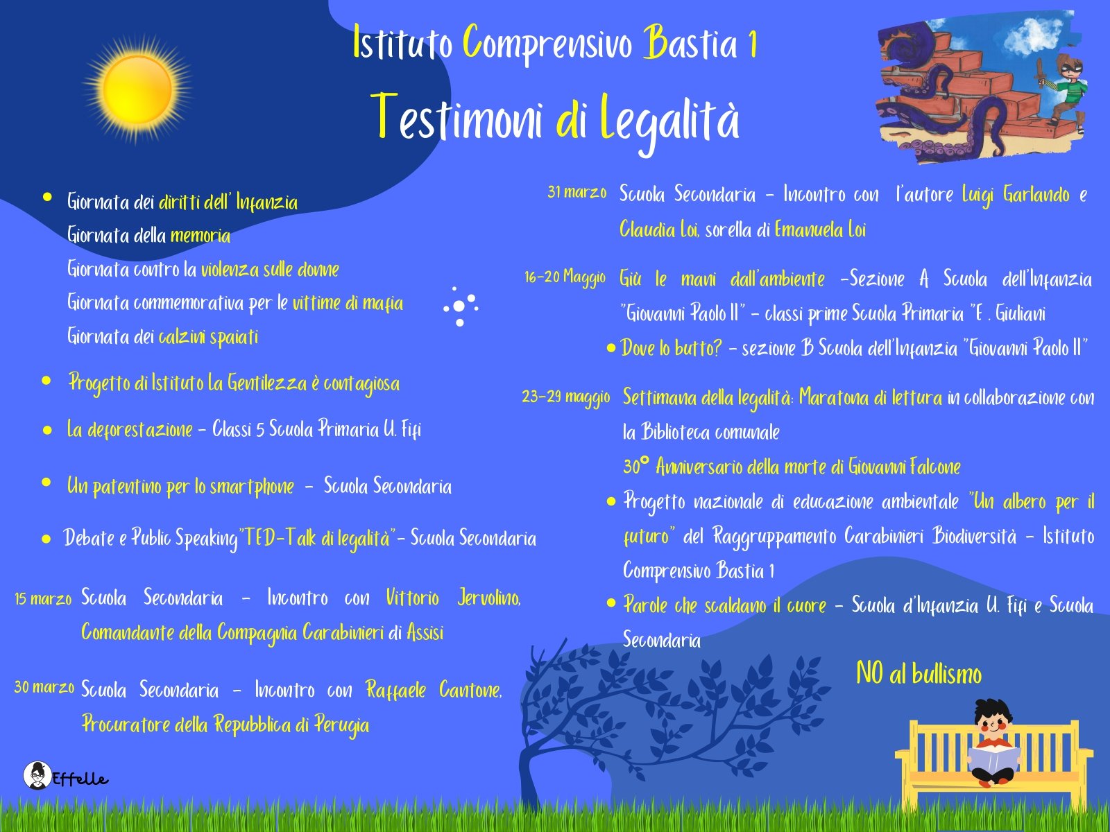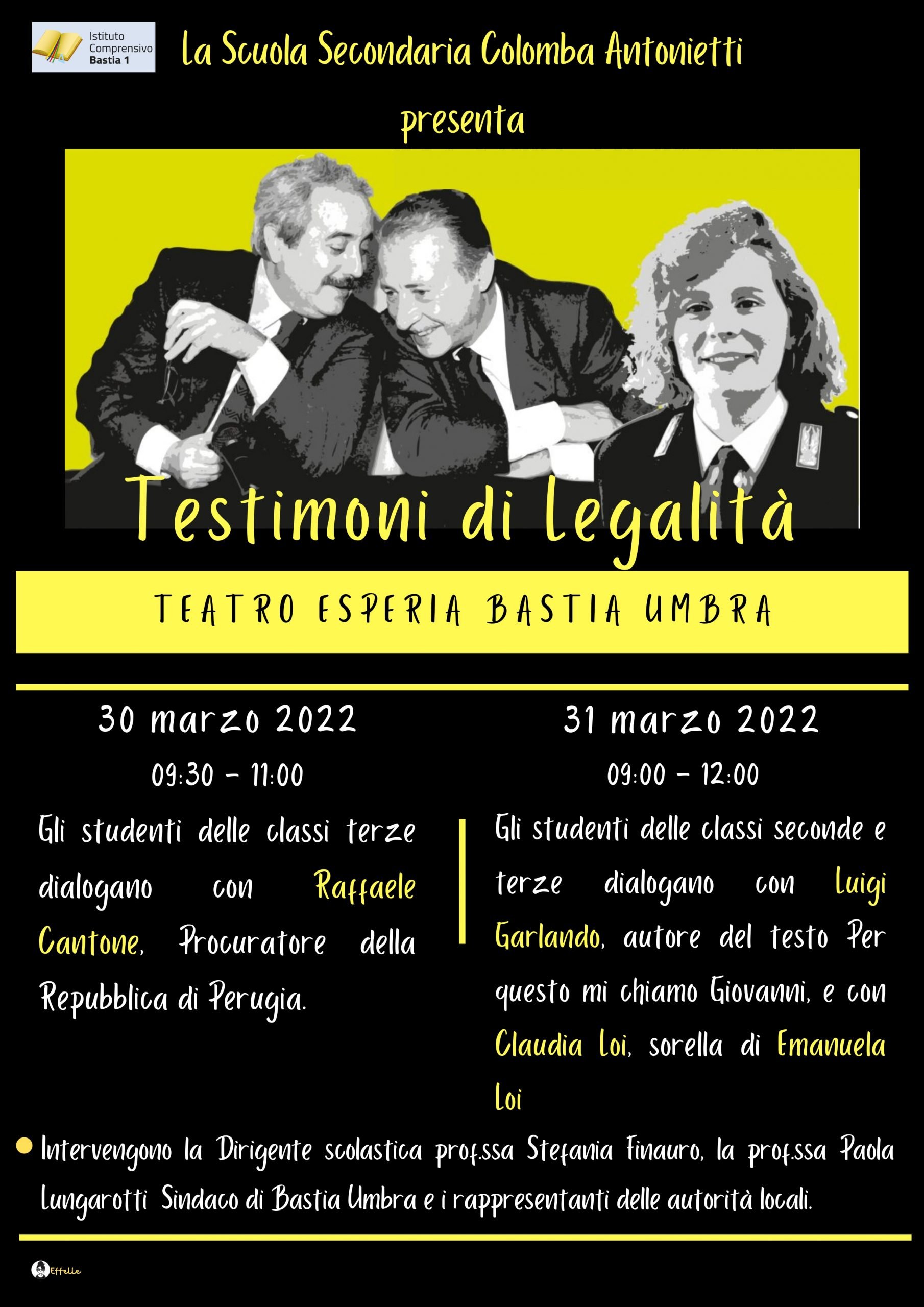 In ricordo dell’anniversario della morte di Giovanni Falcone e Paolo Borsellino, l’Istituto Comprensivo Bastia 1 promuove il Progetto Testimoni di Legalità con attività che coinvolgeranno gli alunni dalla scuola dell’infanzia alla secondaria di I grado.