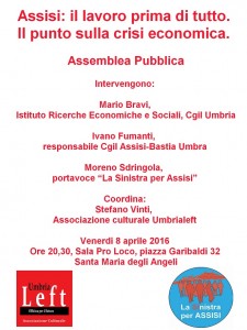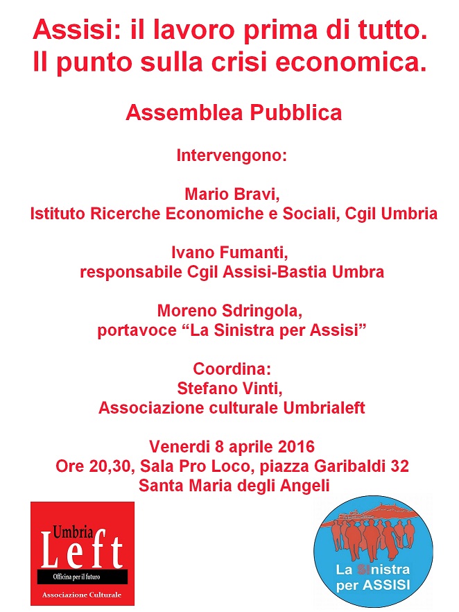 Per ragionare e riflettere una volta ancora sulle questioni che riguardano la crisi economica e il lavoro prima di tutto, venerdi 8 aprile 2016, alle ore 20,30, presso la Pro Loco, piazza Garibaldi 32, a Santa Maria degli Angeli, ci sarà una assemblea pubblica con interventi di Mario Bravi, Istituto Ricerche Economiche e Sociali Cgil Umbria, Ivano Fumanti, responsabile Cgil Assisi-Bastia Umbra, Moreno Sdringola, portavoce comunale La Sinistra per Assisi. L’iniziativa sarà coordinata da Stefano Vinti, coordinamento nazionale Sinistra Lavoro.