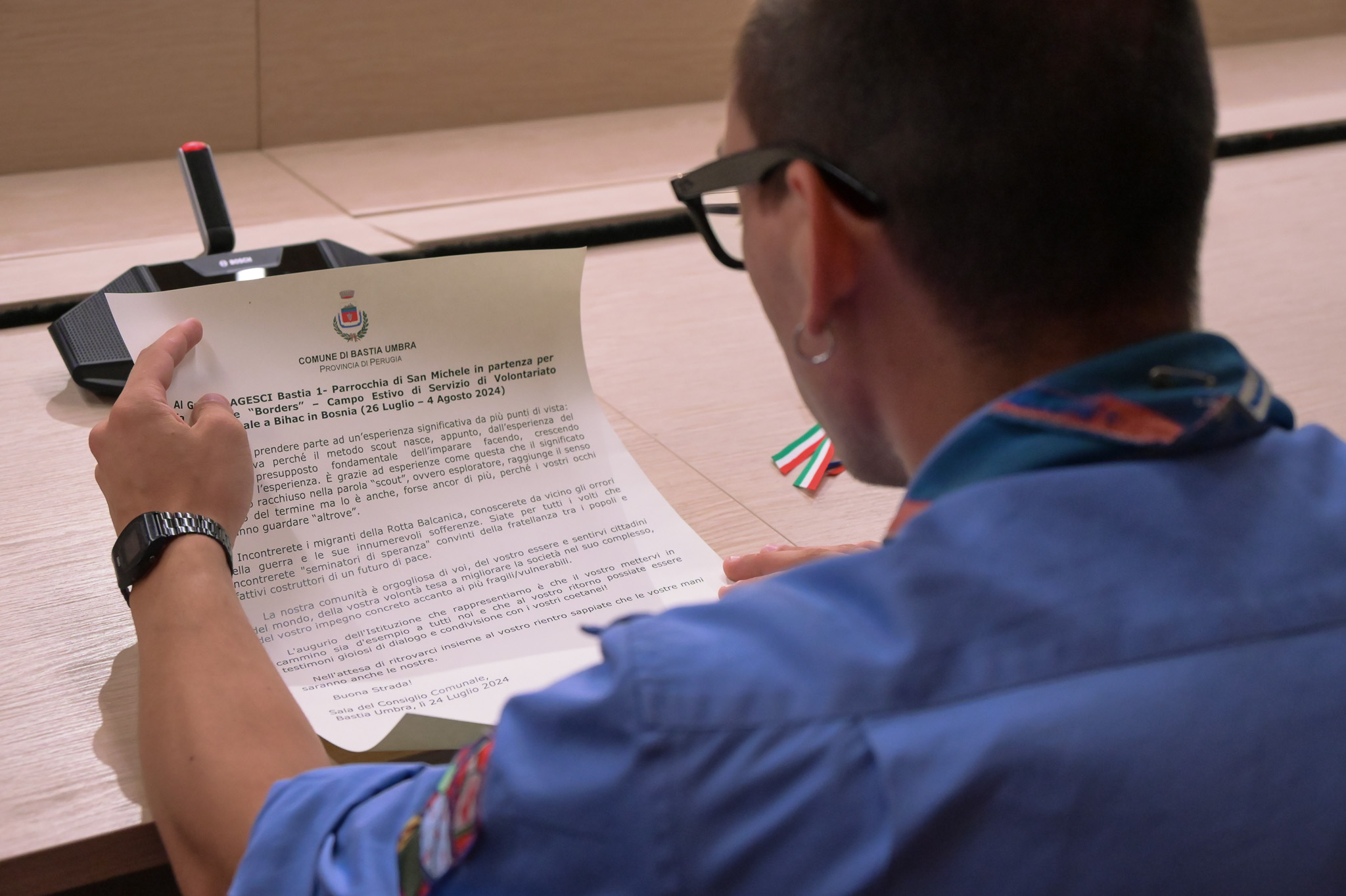 Ieri sera, presso la Sala del Consiglio Comunale, l’Amministrazione Comunale, rappresentata dal Sindaco Erigo Pecci, l’Assessora alle Politiche Sociali Elisa Zocchetti e il Consigliere Pablo Tombolesi, ha accolto il “Clan Perseidi” del Gruppo AGESCI Bastia 1 – Parrocchia di San Michele che il prossimo 26 Luglio partirà per Bihac in Bosnia nell’ambito del Progetto “Borders 2024”.