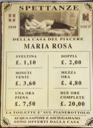All’ingresso la guardiana (di solito un’ex prostituta che nessuno più voleva e che viveva di mance) si faceva consegnare borse, ombrelli e bastoni, che erano vietati all’interno, e controllava le carte di identità dei più giovani, che potevano frequentare i bordelli solo a partire dai 18 anni.