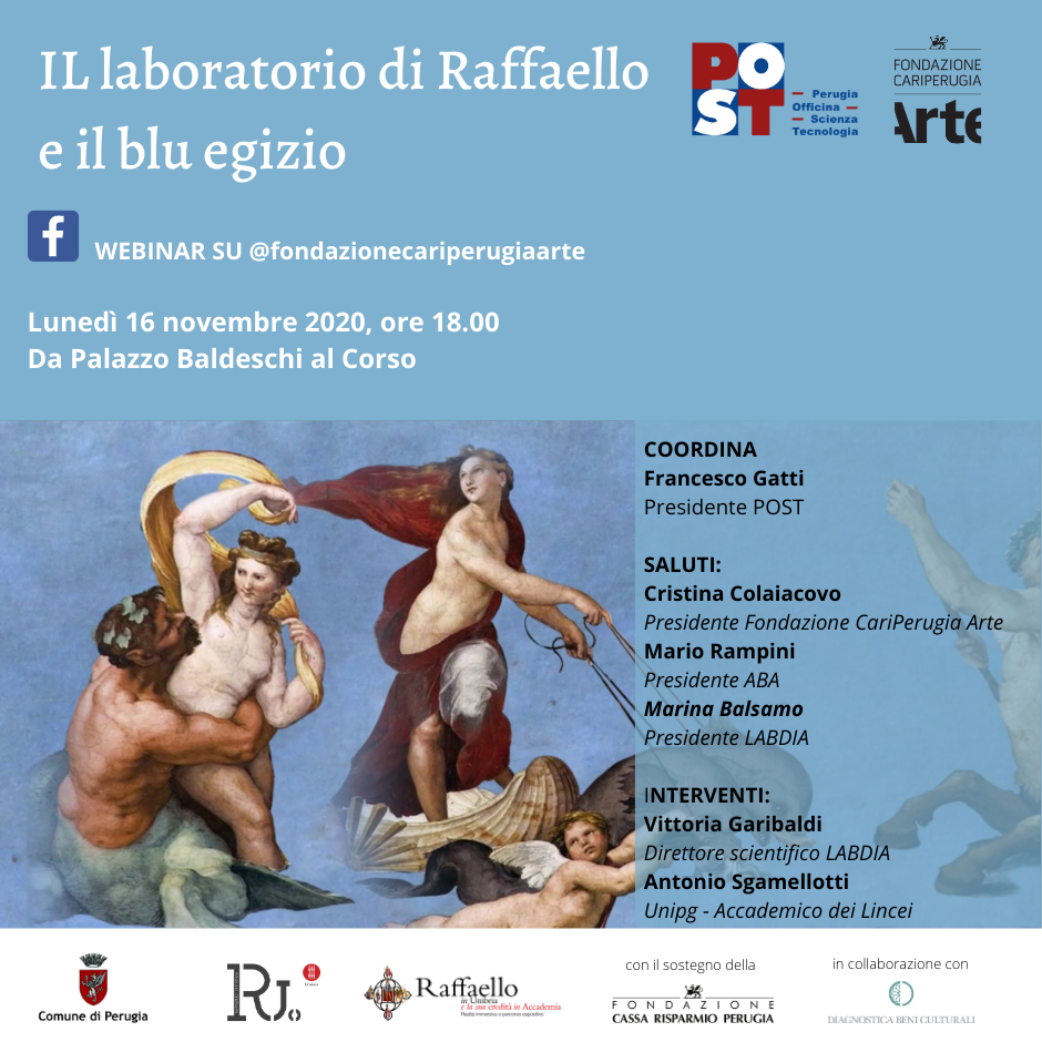 Lunedì prossimo, 16 novembre, dalle 18.00 sul canale Facebook della Fondazione CariPerugia Arte si potrà assistere al webinar “Il laboratorio di Raffaello e il blu Egizio”. Si tratta di un focus sul lavoro del Laboratorio di Diagnostica per i Beni Culturali di Spoleto le cui attività di ricerca si sono subito concentrate su alcuni progetti importanti, sia nel contesto nazionale che internazionale dal quale sono emersi i primi risultati. Tra questi merita una attenzione particolare il lavoro effettuato sull’affresco dipinto da Raffaello, raffigurante “Il trionfo di Galatea” a Villa Farnesina a Roma. Il Laboratorio è stato, infatti, incaricato dall’Accademia Nazionale dei Lincei di eseguire particolari indagini mirate sull’opera raffaellesca in considerazione della decennale esperienza e della disponibilità delle più aggiornate strumentazioni diagnostiche portatili e non invasive.