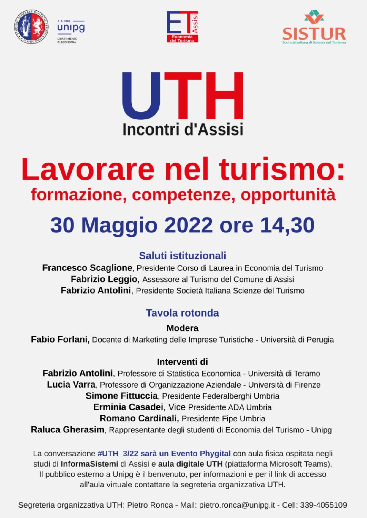 L’incontro sarà aperto dai saluti istituzionali di Francesco Scaglione, Presidente Corso di Laurea in Economia del Turismo, di Fabrizio Leggio, Assessore al Turismo del Comune di Assisi e di Fabrizio Antolini, Presidente Società Italiana Scienze del Turismo.
