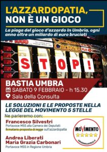 Per tale motivo ci pregiamo di invitarVi all’evento che abbiamo organizzato presso la “Sala della Consulta” del Comune di Bastia Umbra, in piazza Matteotti, 2, per il giorno 9 febbraio 2019 dalle ore 15:30 alle 17 che ha come tema “L’azzardopatia non è un gioco”. Interverranno in veste di relatori l’Onorevole Francesco Silvestri, Deputato alla Camera del MoVimento 5 Stelle, promotore di un disegno di legge sul tema delle ludopatie, i Consiglieri della Regione Umbria Andrea Liberati e Maria Grazia Carbonari, oltre a varie associazioni attive su tali tematiche come la ANGLAD (comunità San Patrignano) con varie testimonianze di esperienze dirette del fenomeno, ormai è diventato una vera e propia piaga che colpisce trasversalmente tutte le fascie sociali.
