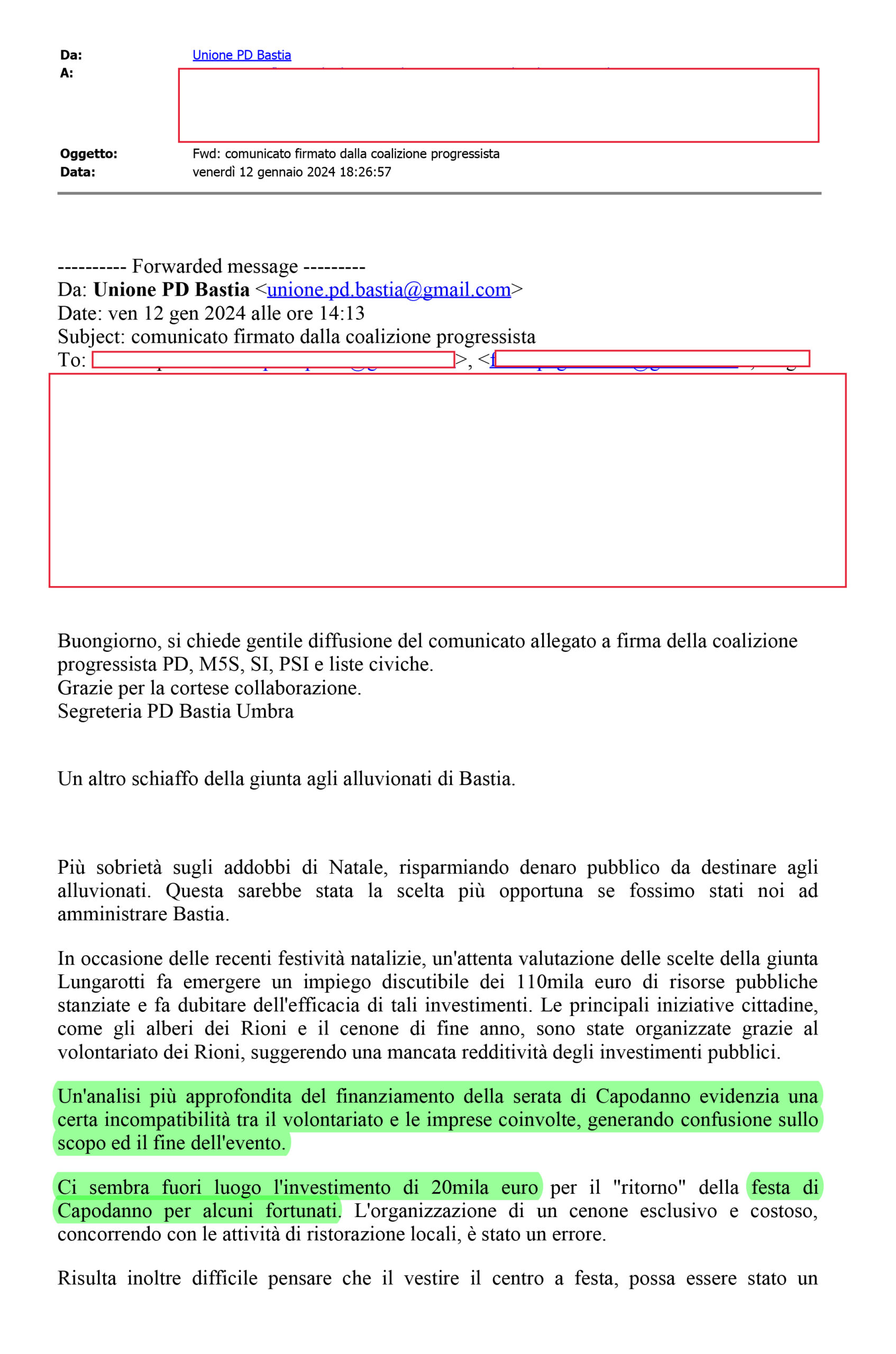 Bastia Umbra, 21/01/25 – Nel 2024, con un comunicato stampa, la coalizione progressista aveva criticato aspramente la precedente amministrazione di centrodestra per aver speso 20.000 euro nell’organizzazione di un cenone a pagamento, sottolineando che sarebbe stato meglio utilizzare tali fondi per sostenere le famiglie in difficoltà. Oggi, ci troviamo a dover prendere atto di una situazione che solleva interrogativi: nel 2025, la stessa coalizione, ora al governo del comune, ha deciso di finanziare una festa di Capodanno a pagamento, gestita da una associazione nata ad Assisi, senza il coinvolgimento di altre associazioni di Bastia, stanziando ben 18.000 euro di fondi pubblici.