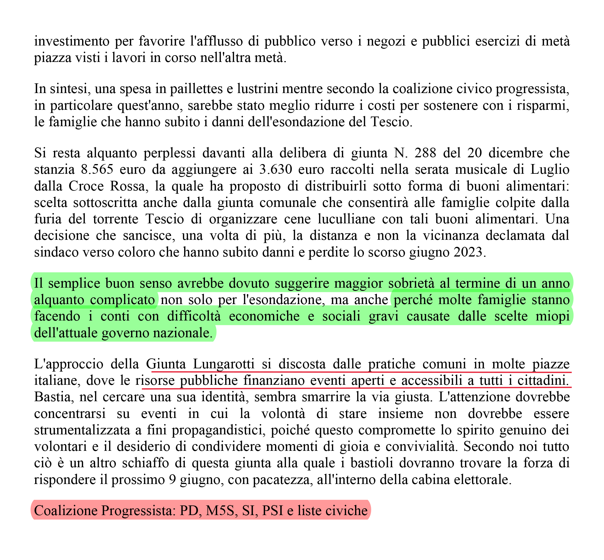 Invitiamo i rappresentanti della coalizione a spiegare e chiarire le loro decisioni e a rendere pubblico il risultato economico della serata, per garantire che le risorse comunali siano utilizzate in modo equo e responsabile senza incorrere in eventuali censure della Corte dei Conti.