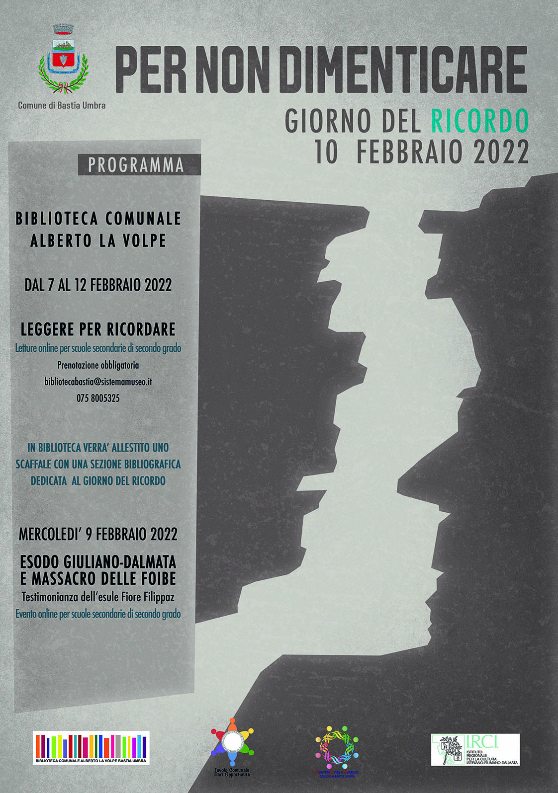 Il programma di iniziative del Comune di Bastia Umbra per il 10 Febbraio, Giorno del Ricordo, inizierà Lunedì 7 Febbraio, con l’iniziativa “Leggere per ricordare”, letture online per le scuole secondarie di secondo grado a cura della Biblioteca Comunale, che proseguiranno fino a Sabato 12 Febbraio. (prenotazione obbligatoria bibliotecabastia@sistemamuseo.it 075 8005325)