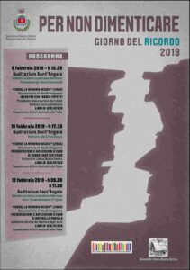 Il Programma del Giorno del Ricordo (10 Febbraio), organizzato dal Comune di Bastia Umbra – Assessorato alla Cultura, si svilupperà su tre date; le iniziative si svolgeranno sempre presso l’Auditorium S. Angelo di Piazza Umberto I°: