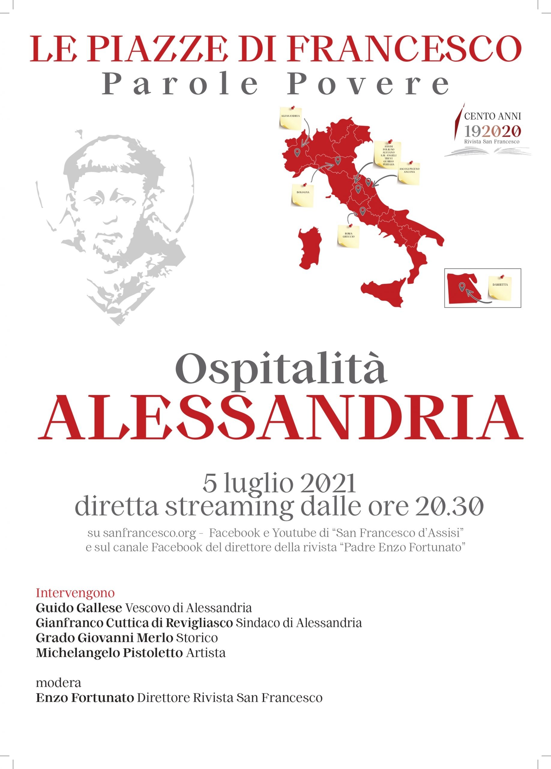 ASSISI (PERUGIA), 2 LUG – Continuano gli appuntamenti nelle piazze italiane in occasione dei 100 anni della rivista San Francesco. Lunedì 5 luglio alle 20.30 in piazza Giovanni XXIII ad Alessandria, in diretta streaming su sanfrancesco.org, si terrà l’incontro dal titolo “Parole povere: ospitalità”. Parteciperanno, dopo i saluti del Sindaco di Alessandria, Gianfranco Cuttica di Revigliasco, il Vescovo, Mons. Guido Gallese, l’artista, Michelangelo Pistoletto, lo storico, Grado Giovanni Merlo, e il direttore della rivista San Francesco, Padre Enzo Fortunato.
