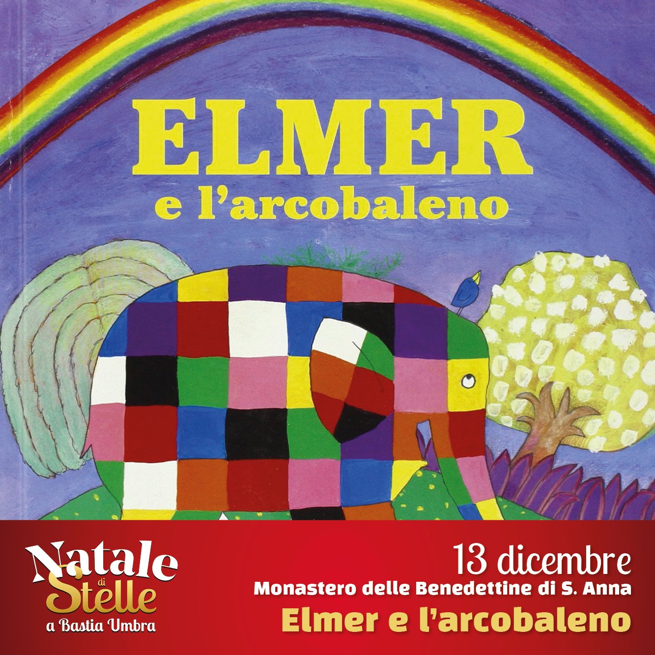 Lunedì 13 dicembre, ore 17.00 – Elmer e l’arcobaleno, a cura della Biblioteca Comunale “A. La Volpe”Un incontro per famiglie e bambini tra musica, storie, lingue e linguaggi. Lingue: Italiano e Portoghese Brasiliano. Musiche di Licia Di Domenico. In collaborazione con CIDIS Onlus e Cassa di Risparmio di Perugia.