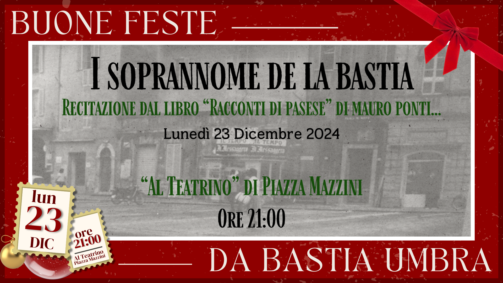 Lunedì 23 Dicembre alle ore 21:00, presso il “Teatrino” di Piazza Mazzini vi aspettiamo per una serata in cui ripercorrere la storia di Bastia e dei personaggi che l’hanno caratterizzata dagli anni’20 agli anni ’70, rivisitata in chiave poetica da Lamberto Ponti.