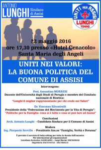 Si è svolto nel pomeriggio di Domenica 22 Maggio il convegno dal titolo “Uniti nei valori – La buona politica del Comune di Assisi” in cui sono intervenuti la prof.ssa Assuntina Morresi, il dott. Vincenzo Silvestrelli ed il candidato sindaco Antonio Lunghi.