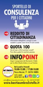 Presso la Sede Elettorale del MoVimento 5 Stelle di Bastia Umbra è in funzione lo SPORTELLO DI CONSULENZA PER I CITTADINI per fornire gratuitamente informazioni ed orientamento sulle misure recentemente introdotte dal Governo ed in particolare il Reddito di Cittadinanza e Quota 100. Tutti coloro che fossero interessati potranno usufruire del servizio dal lunedì al venerdì ogni mattina dalle 10 alle 12 ed il pomeriggio dalle 17 alle 18, in piazza Mazzini 77, vicino la Sede della Pro-Loco. Per eventuali particolari esigenze di orario si riceve anche su appuntamento chiamando il numero 347-4197289 oppure inviando una mail al seguente indirizzo Info@bastiaumbra5stelle.it.